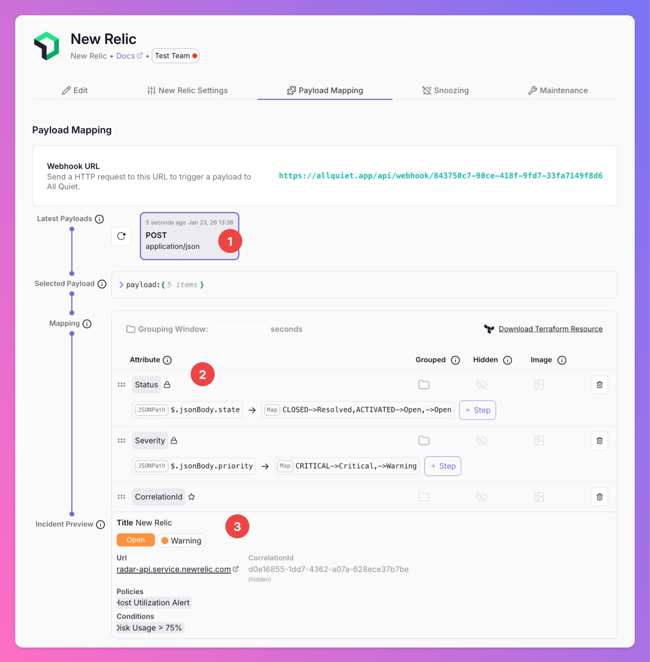 You’re almost done. 🥳 You can now test how New Relic’s palyoad maps to your All Quiet incident:3.1 Load New Relic Payload