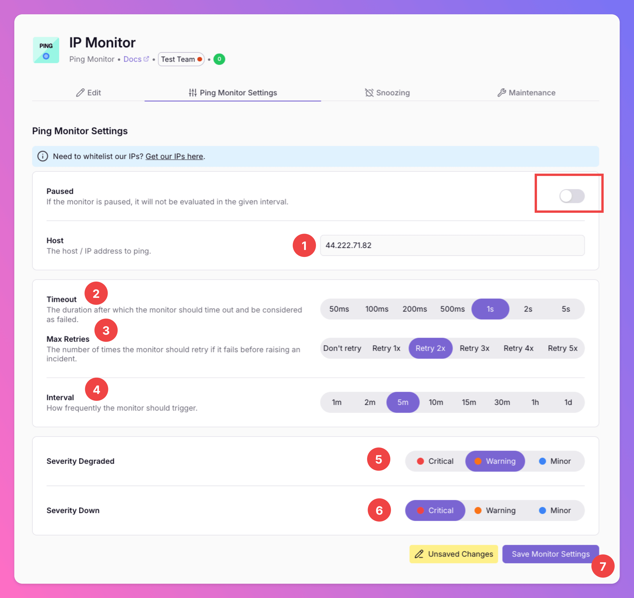 When Ping monitoring checks a target, the system compares the new status with the most recent one. If the status has changed (for example, from Up to Down or from Down to Up), the system processes the result fully. This includes updating records, sending notifications, and managing incidents. If the status remains the same (for example, Up to Up or Down to Down), the system stops early without further processing. This prevents duplicate alerts and avoids unnecessary incident creation. You can also see this in theResponse Logs at the bottom of the Ping Monitor Settings page. The reponse logs will only show one entry per status change, but will update the timestamp based on the last ping for the given status.
