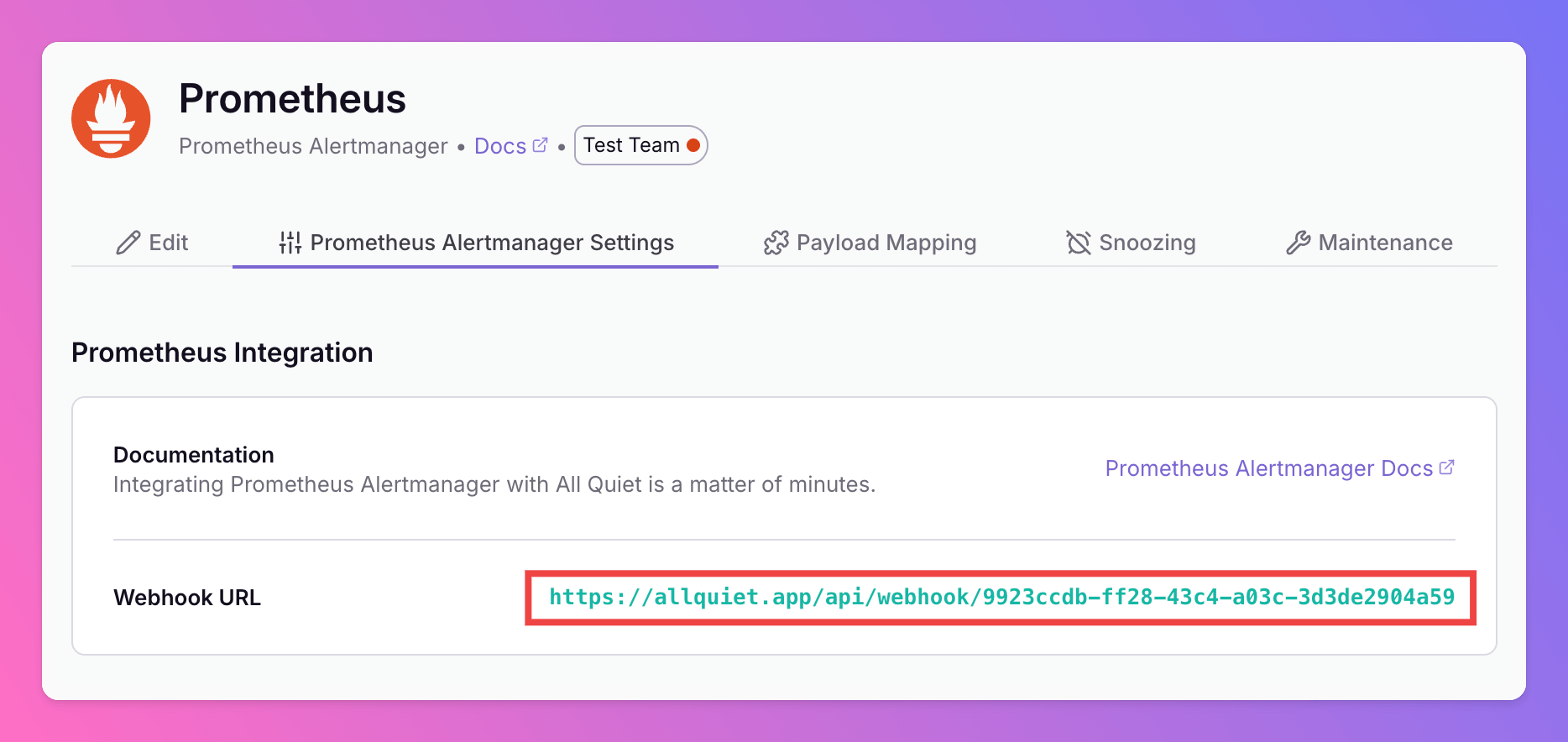 After successfully creating your Prometheus Alertmanager integration, make sure to copy the webhook URL.