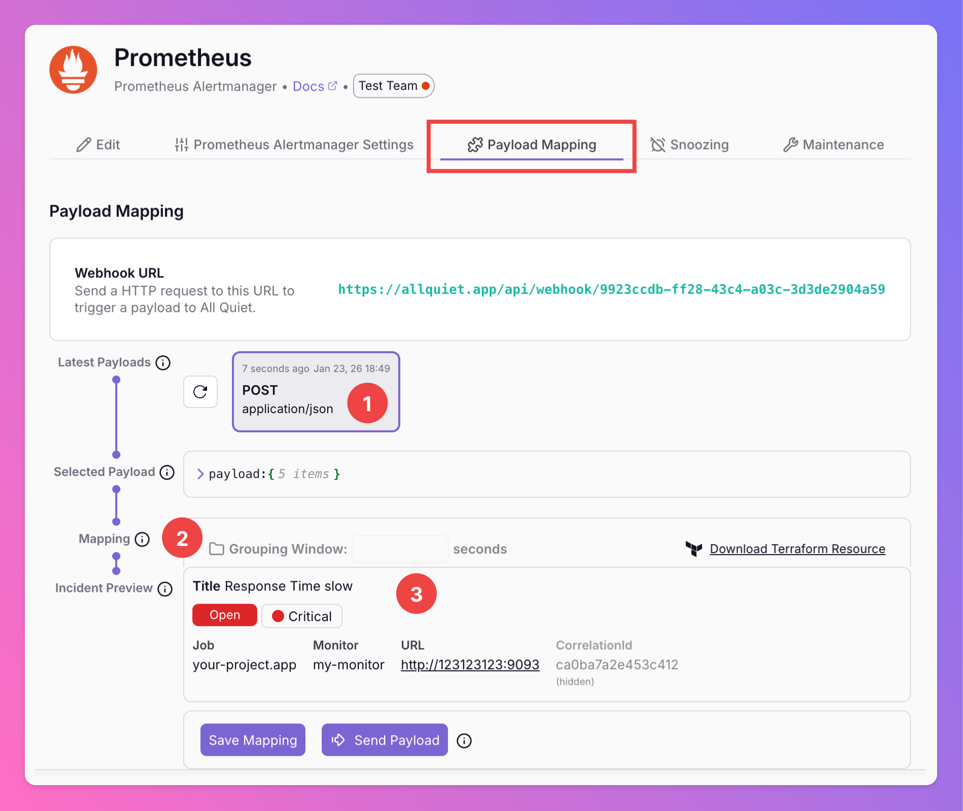 payload mappingwill transform Prometheus alerts into All Quiet incidents. You can adjust the mapping to your liking anytime. - Observe how the mapping transforms the selected Prometheus Alertmanager payload into an All Quiet incident.