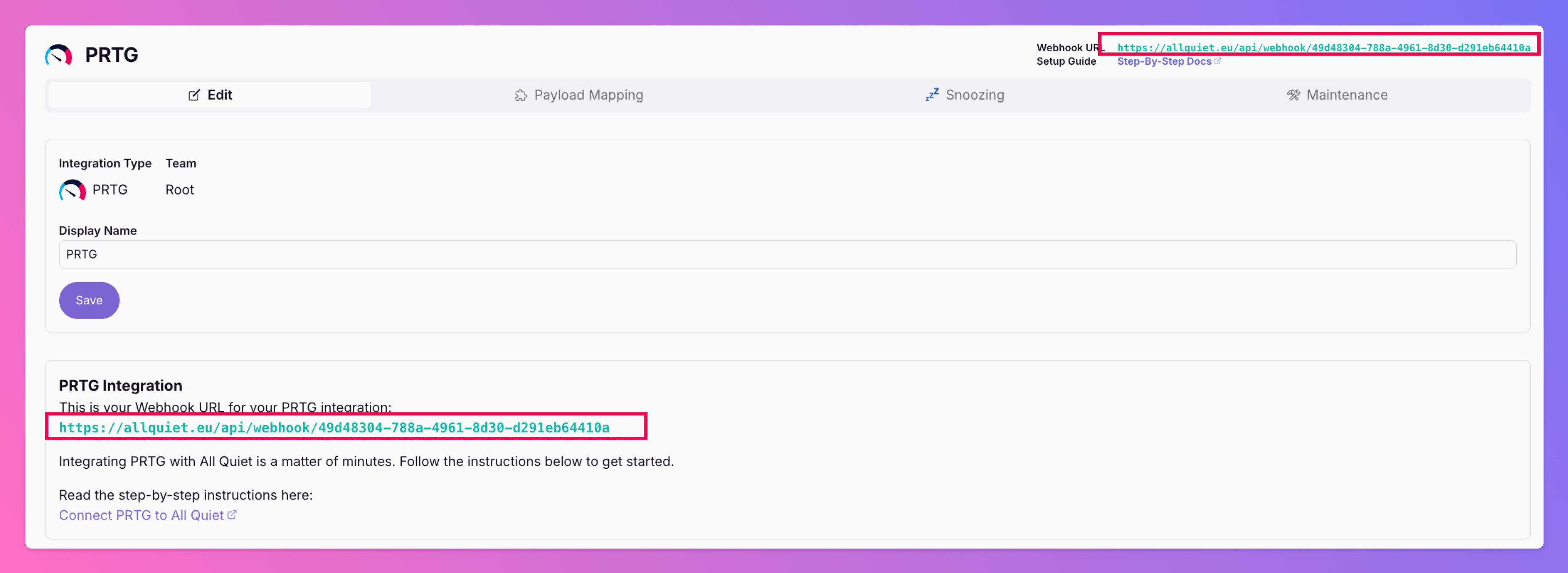 After creating the integration on All Quiet, you can view and copy the webhook URL. You will require this URL in step 2 when configuring the custom integration on PRTG.