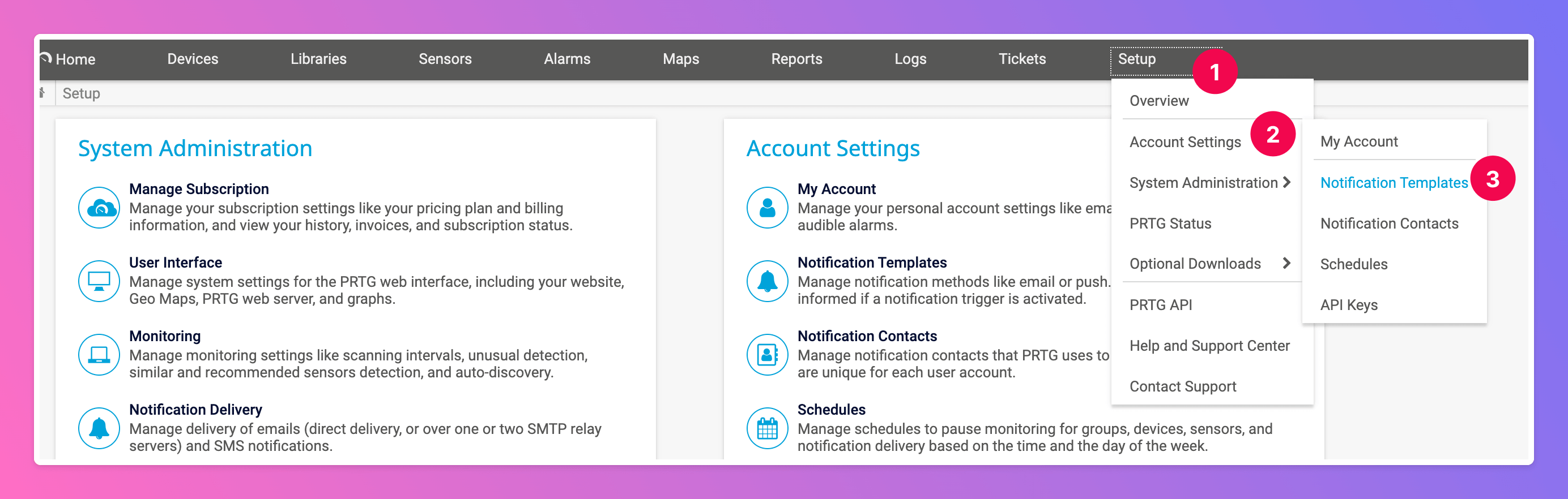Sign in to your PRTG Account. We first need to create a Notification Template that allows us to connect PRTG with All Quiet.- From the home screen, click on
