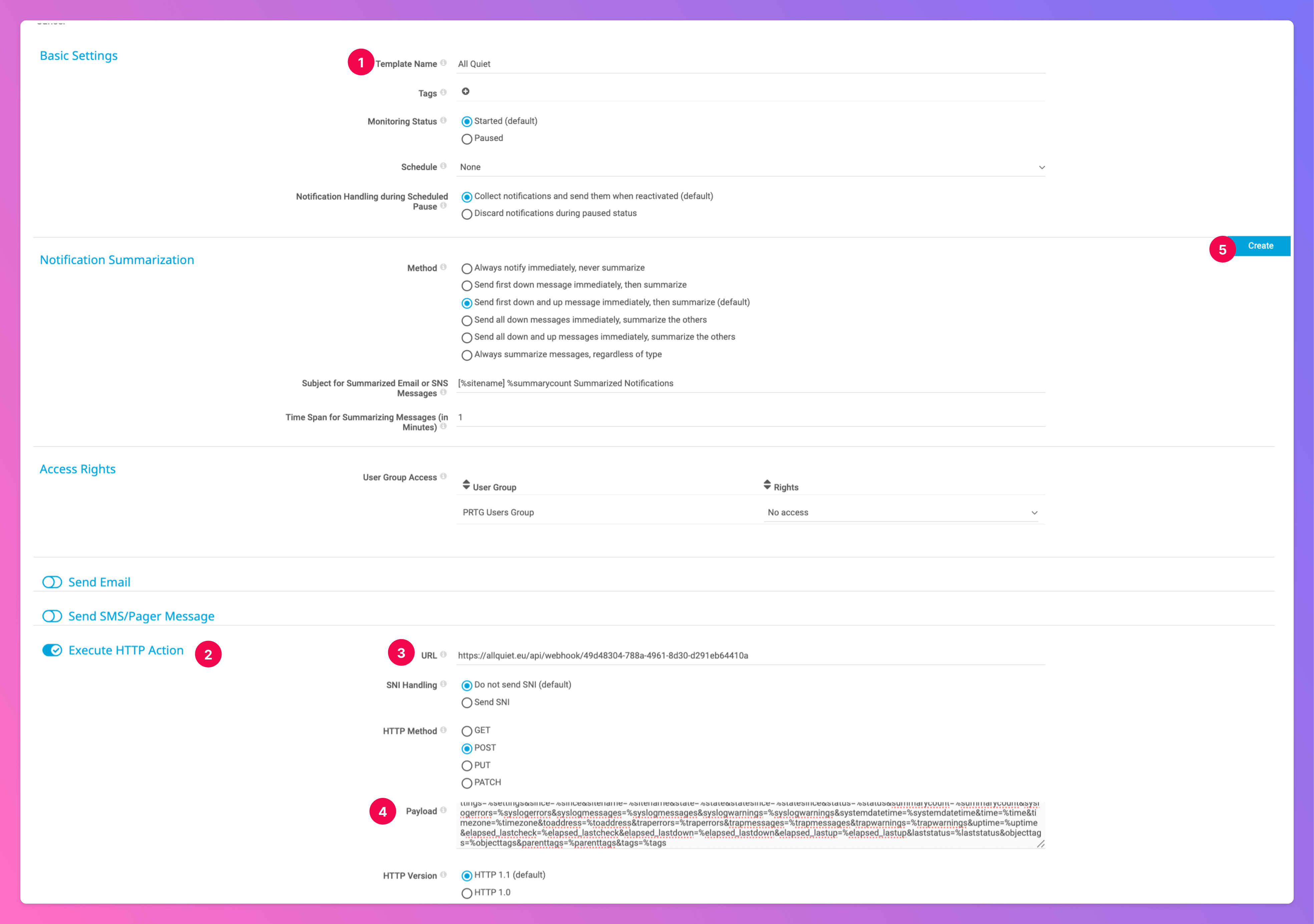 You successfully set up the Notification Template. Next, we need to connect this template with your PRTG to your Monitors to automatically forward alerts to All Quiet.