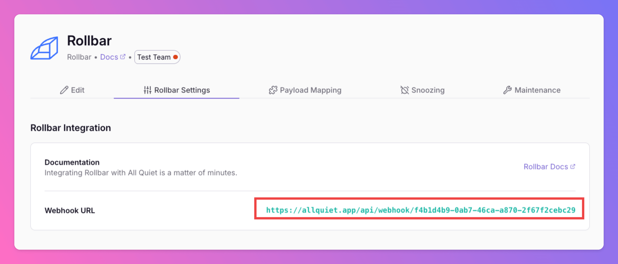 After creating the integration on All Quiet, you can view and copy the webhook URL. You will require this URL in step 2 when configuring the integration on Rollbar’s website.