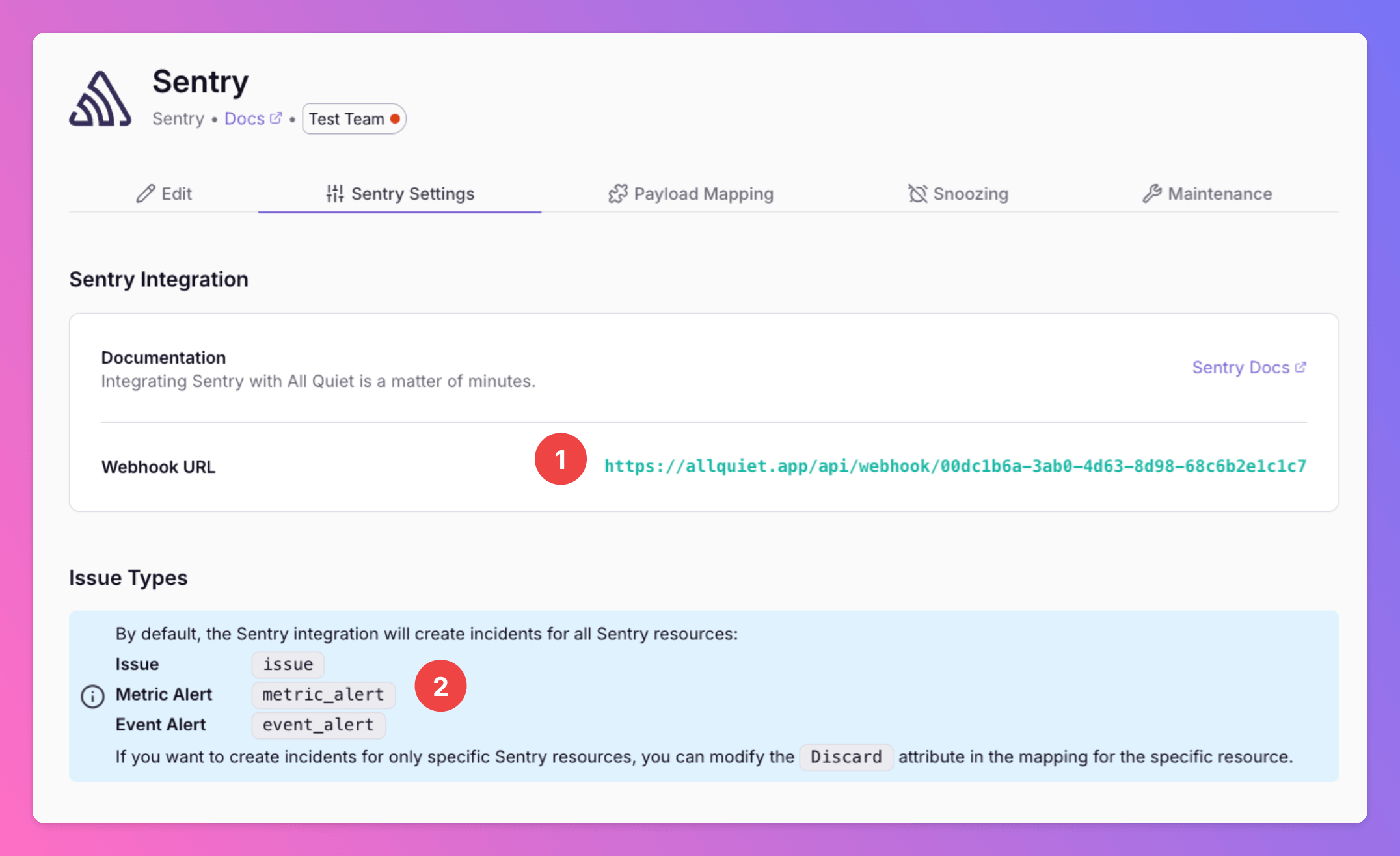 After creating the Sentry integration on All Quiet- you can view and copy the webhook URL. You will require this URL in step 2 when configuring the custom integration on Sentry.