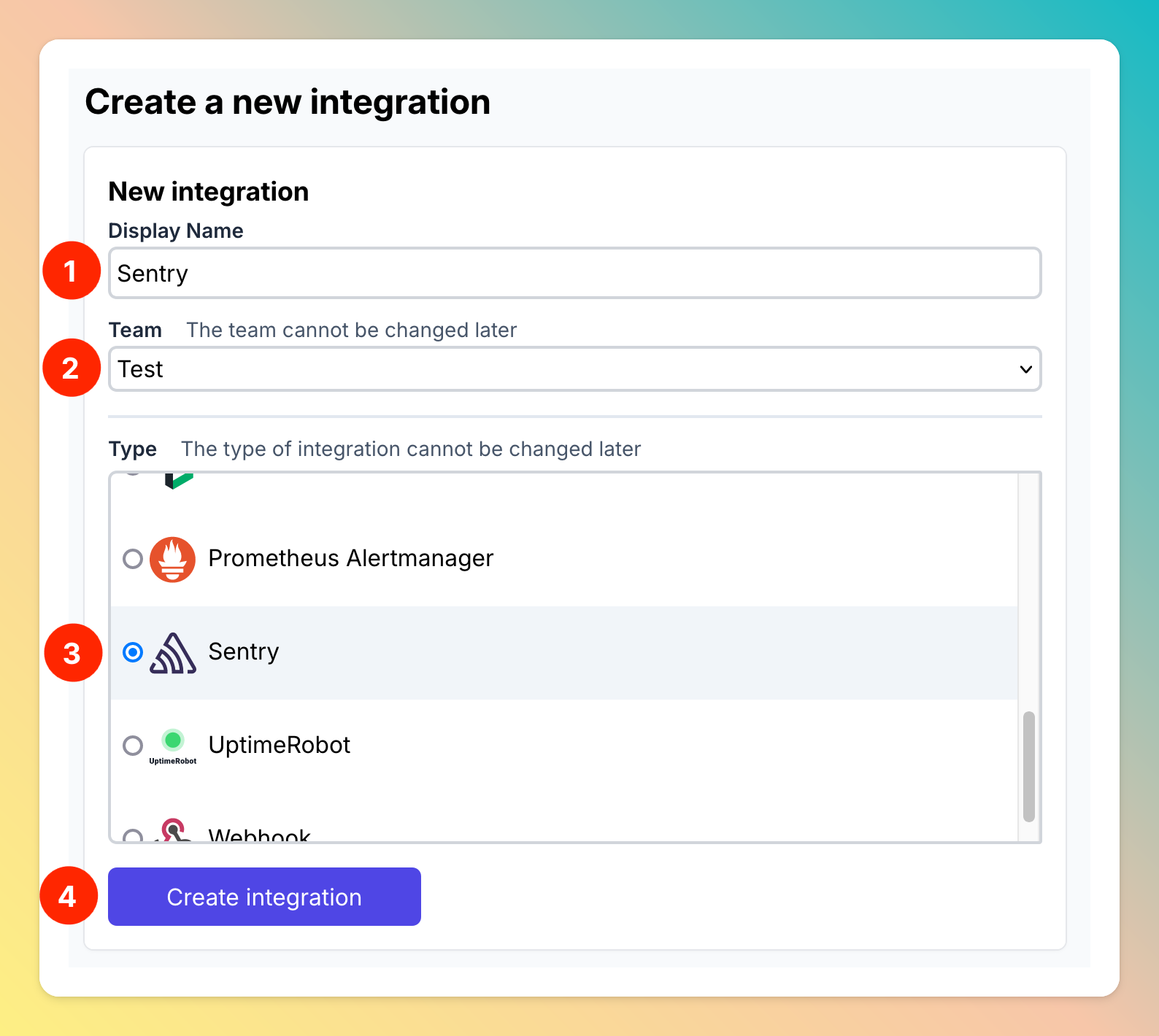 - Enter a display name for your Sentry integration, e.g. “Sentry”.