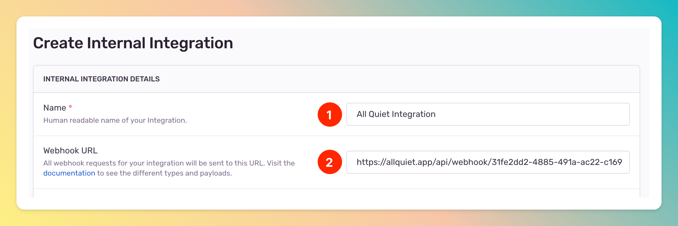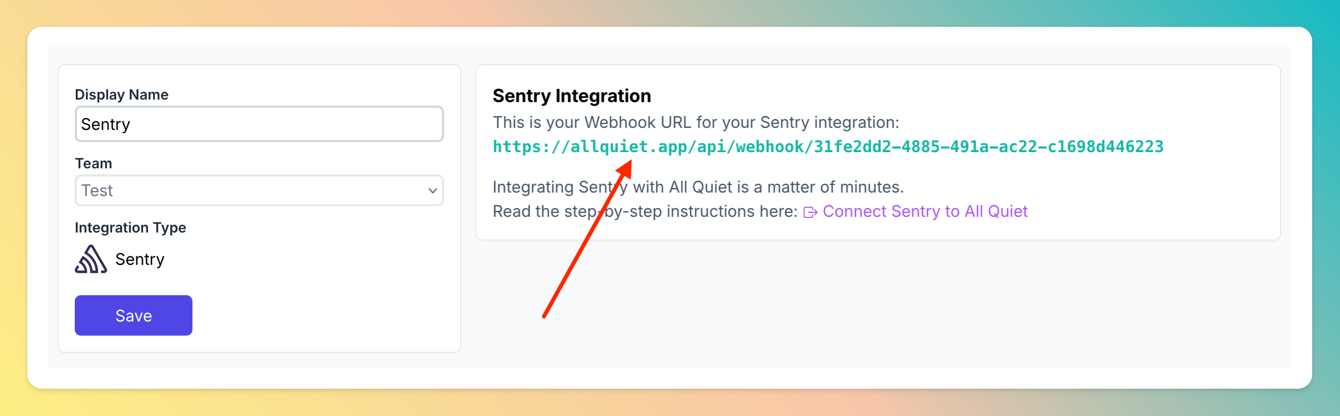 After creating the Sentry integration on AllQuiet, you can view and copy the webhook URL. You will require this URL in step 2 when configuring the custom integration on Sentry.