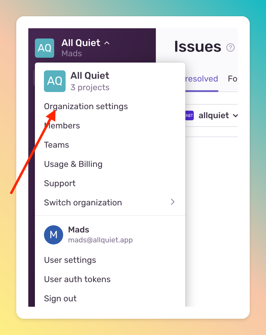 Open your Sentry, click on your Account and navigate toOrganization settings