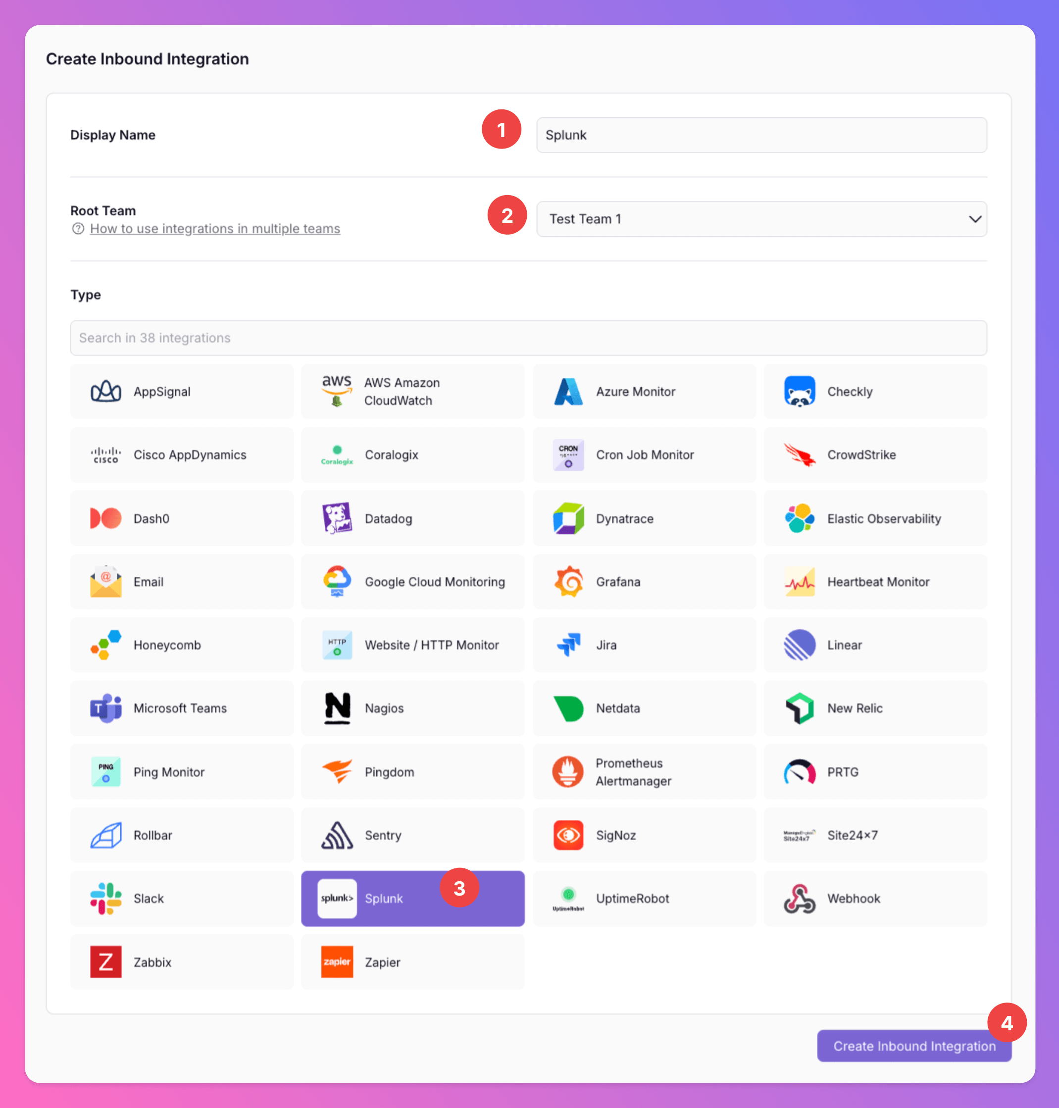 Display Namefor your integration, e.g. “Splunk”. - Select a