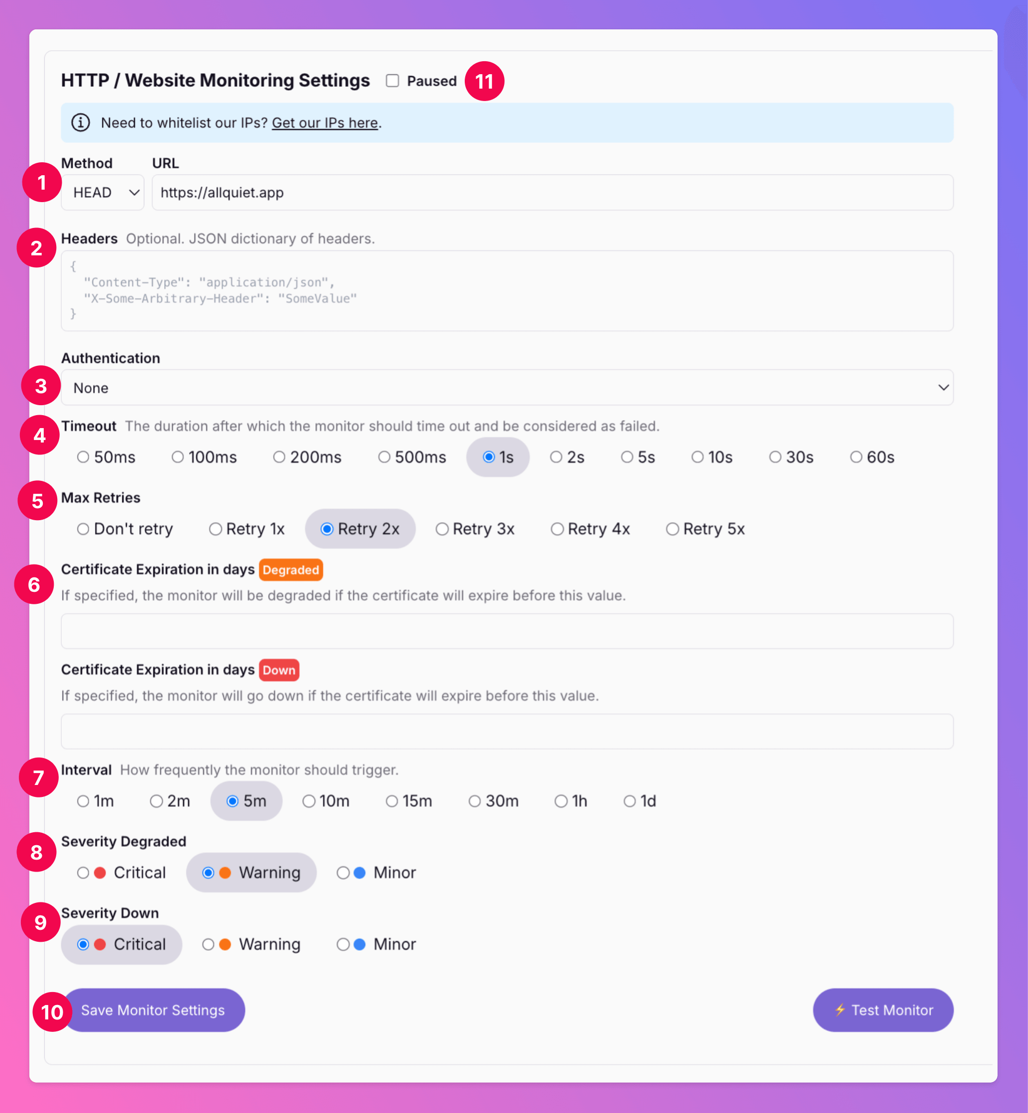 HEAD,GET,POST,PUT,DELETEorPATCH) and enter the URL you want to Monitor. If you want to monitor different URLs, simply set up several monitors. - Optionally, you can add Headers in JSON format.