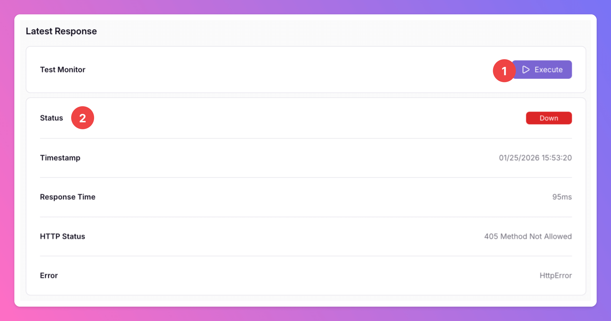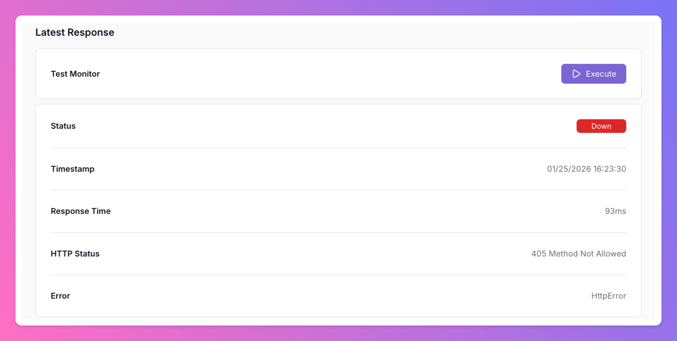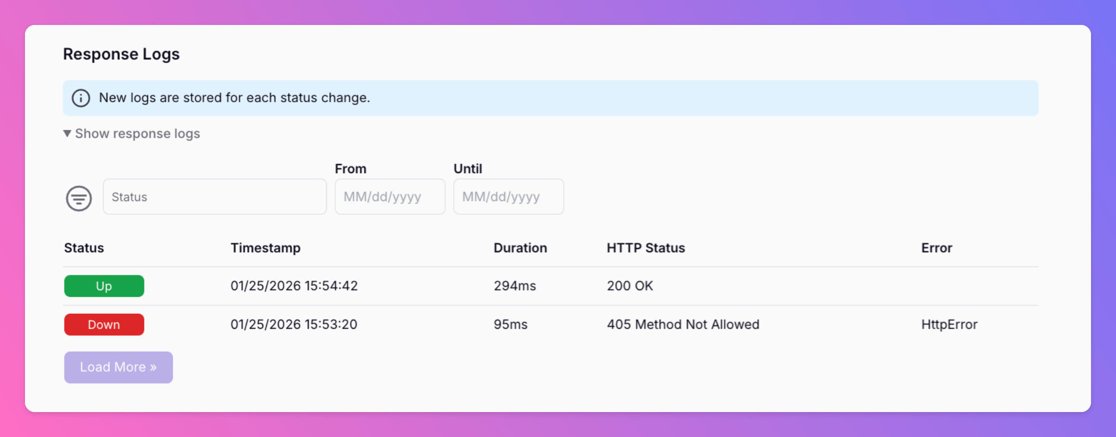 When HTTP monitoring checks a target, the system compares the new status with the most recent one. If the status has changed (for example, from Up to Down or from Down to Up), the system processes the result fully. This includes updating records, sending notifications, and managing incidents. If the status remains the same (for example, Up to Up or Down to Down), the system stops early without further processing. This prevents duplicate alerts and avoids unnecessary incident creation. You can also see this in theResponse Logs at the bottom of the HTTP Monitor Settings page. The reponse logs will only show one entry per status change, but will update the timestamp based on the last response for the given status.