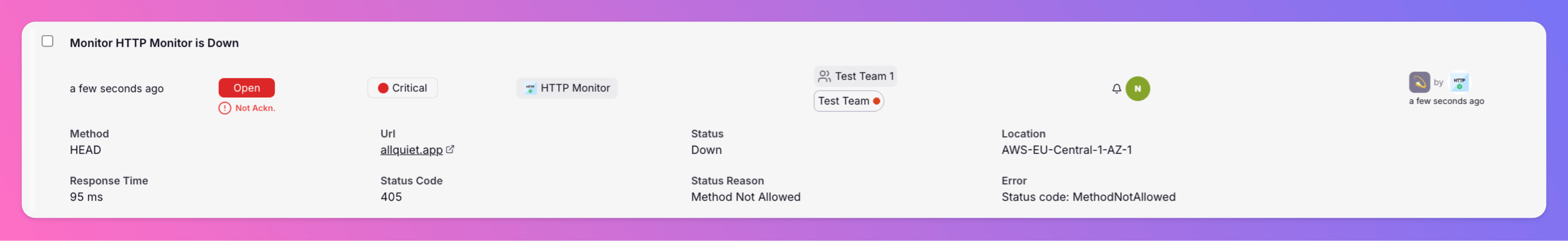 This behavior differs from other inbound integrations, which create a new incident whenever an alert is received if there is no open incident yet. HTTP monitoring is designed to reduce noise by only acting when a real status change occurs.