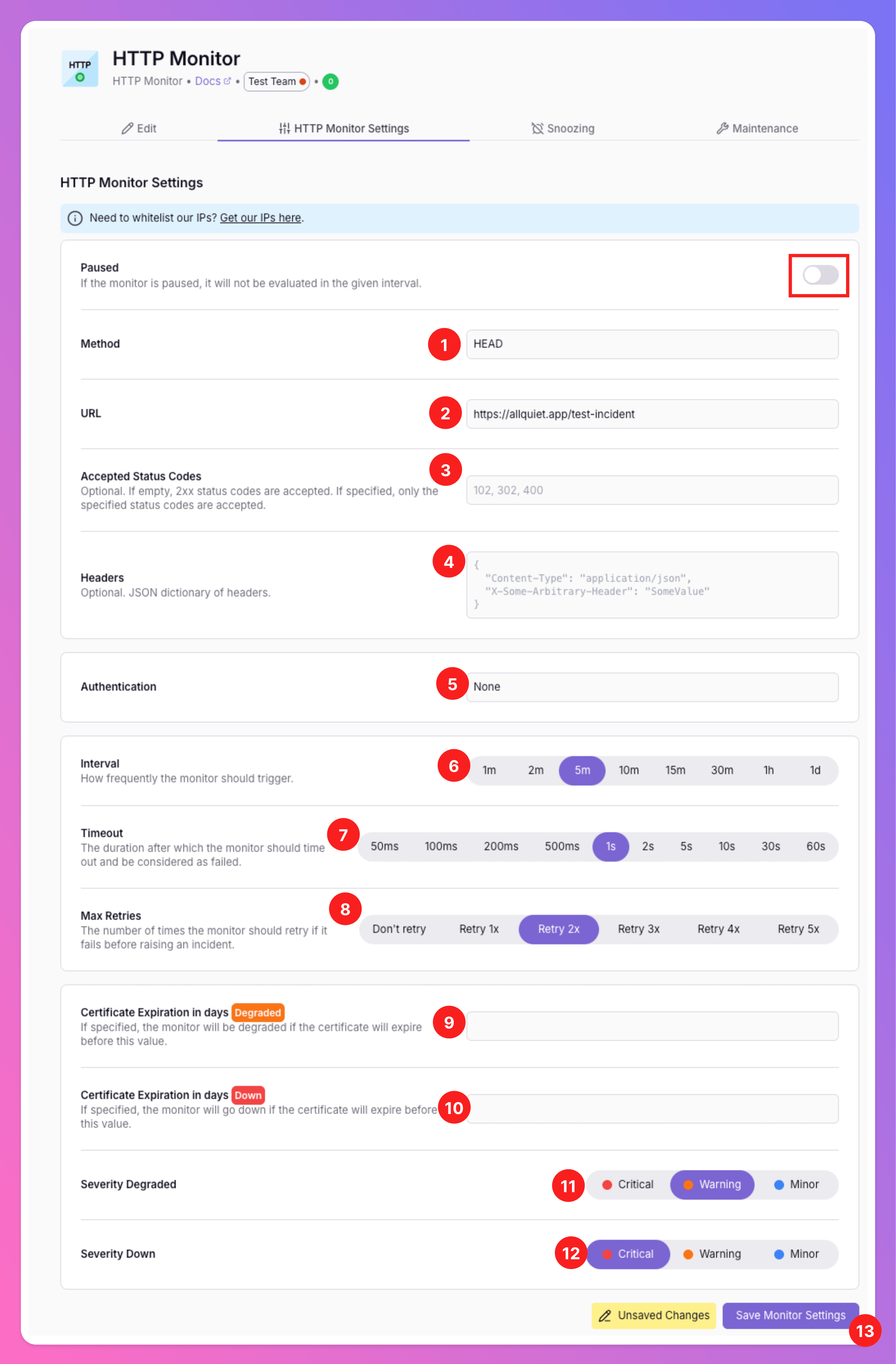 Accepted Status Codes. If empty, 2xx status codes are accepted. If specified, only the specified status codes are accepted and other status codes trigger an incident. - Optionally, you can add Headers in JSON format.