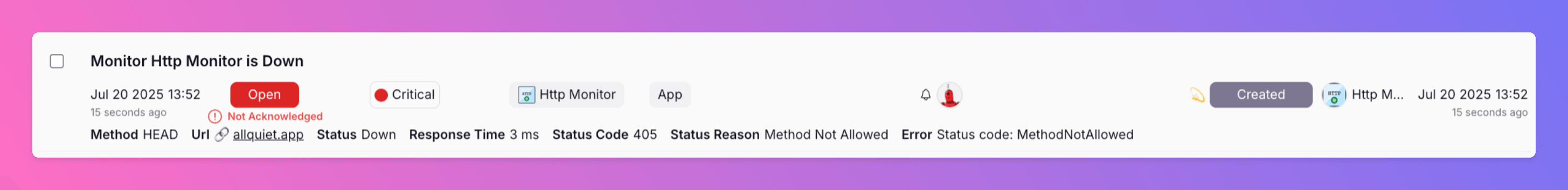 When HTTP monitoring checks a target, the system compares the new status with the most recent one. If the status has changed (for example, from Up to Down or from Down to Up), the system processes the result fully. This includes updating records, sending notifications, and managing incidents. If the status remains the same (for example, Up to Up or Down to Down), the system stops early without further processing. This prevents duplicate alerts and avoids unnecessary incident creation. This behavior differs from other inbound integrations, which create a new incident whenever an alert is received if there is no open incident yet. HTTP monitoring is designed to reduce noise by only acting when a real status change occurs. If you close an incident manually and the status has not changed, the system will not create a new incident for the same issue. This helps you stay focused on real changes, reduces unnecessary noise, and keeps incident management cleaner.