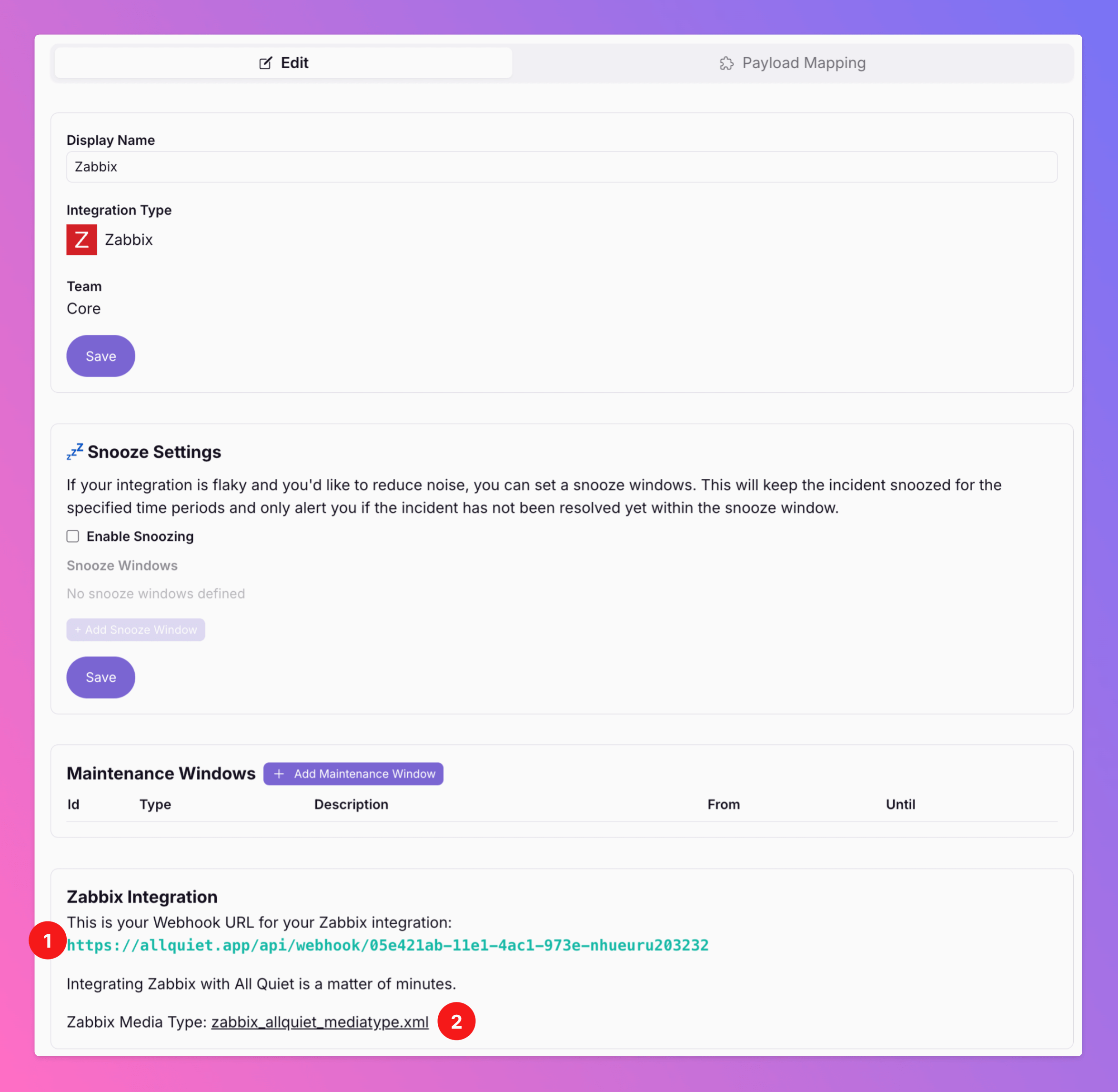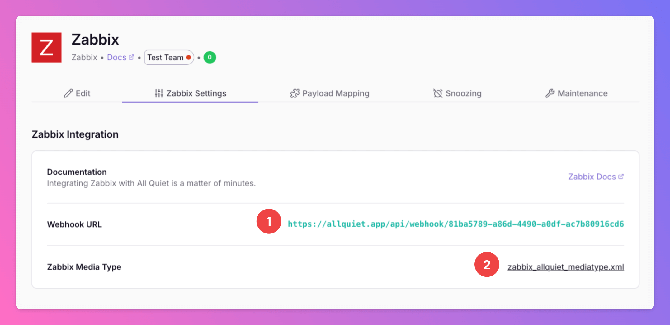 After creating the integration on All Quiet- you can view and copy the webhook URL. You will require this URL in step 2 when configuring the custom integration on Zabbix.