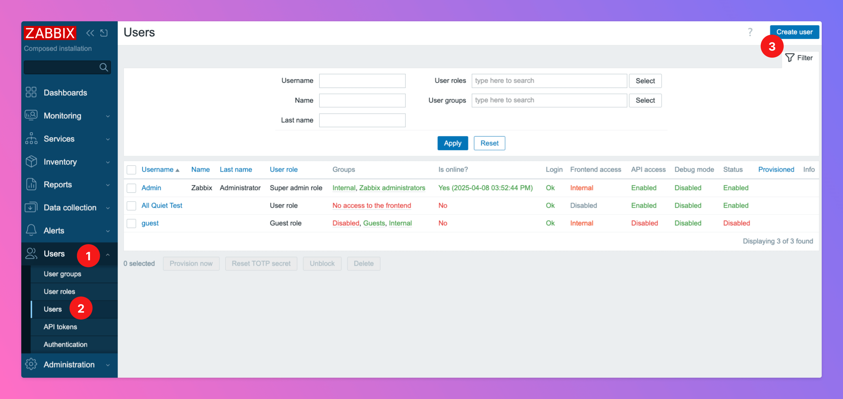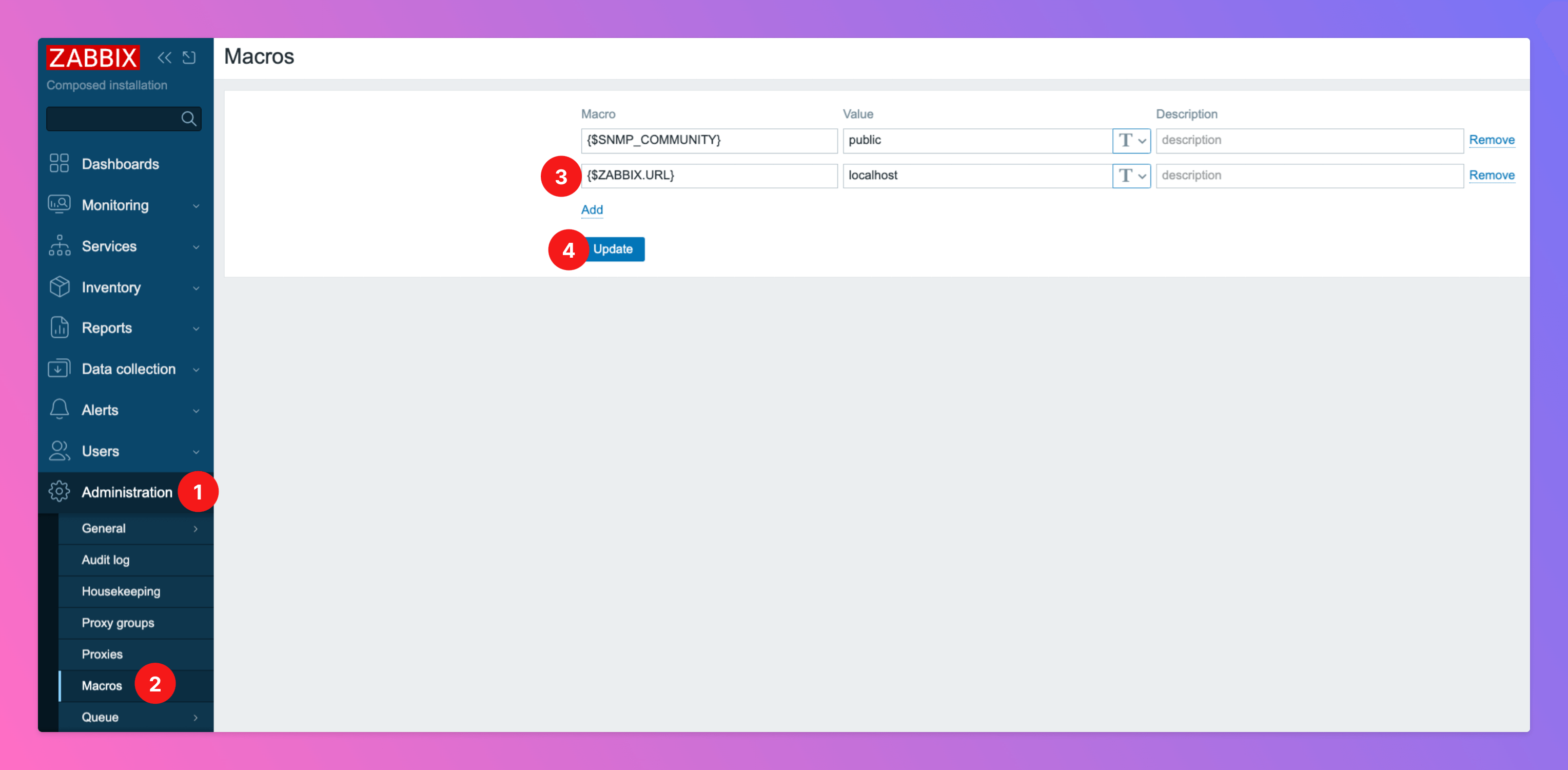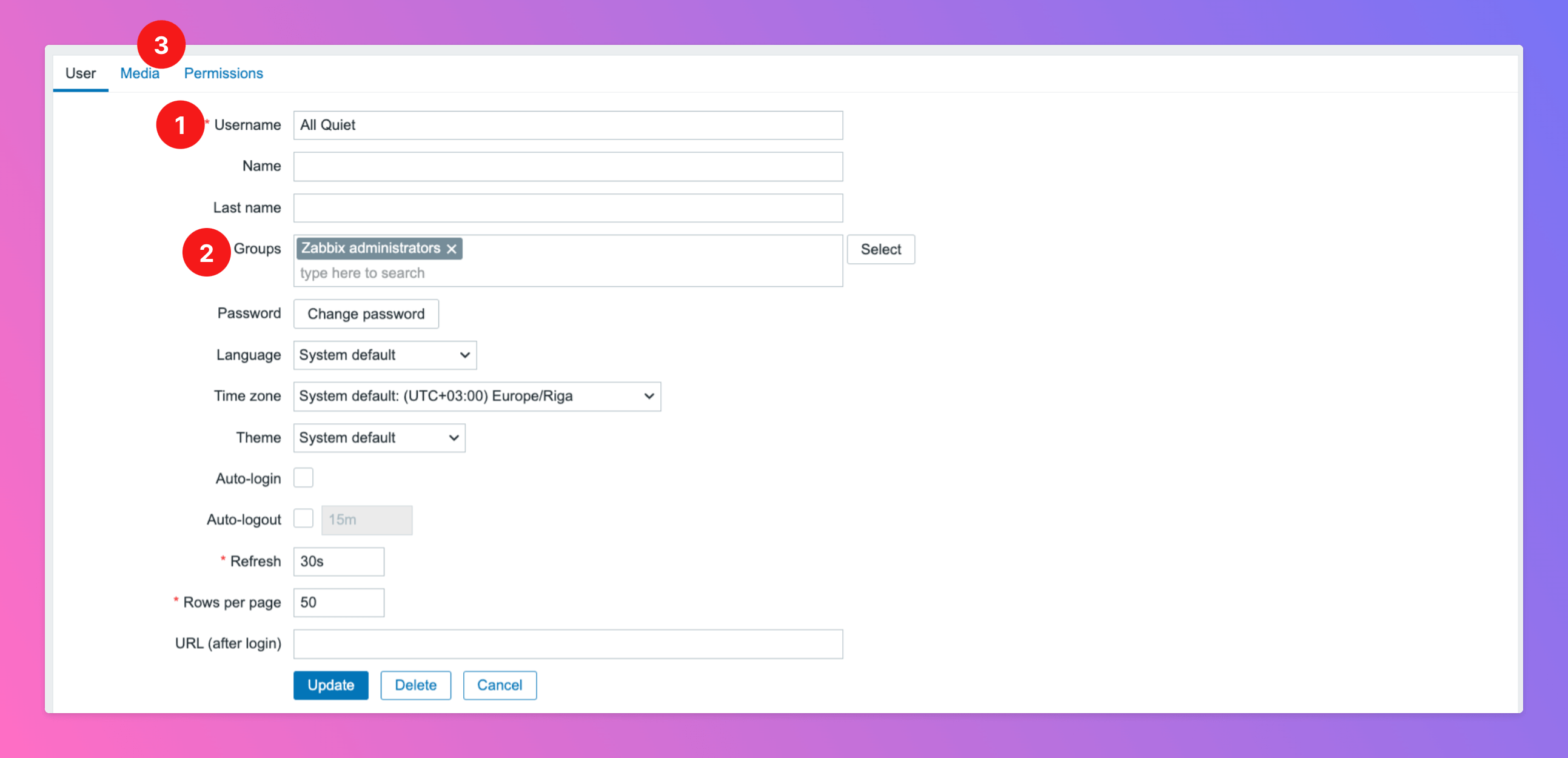 Once you’ve set up an integration of type “Zabbix” with All Quiet, the next crucial steps involve configuring a Zabbix user, connecting it with All Quiet via the Media Type and Webhook and adding it to the correct user group to be able to send alerts to All Quiet. First, you need to sign in to your Zabbix Account.Create Macro