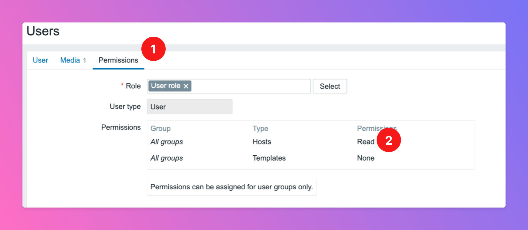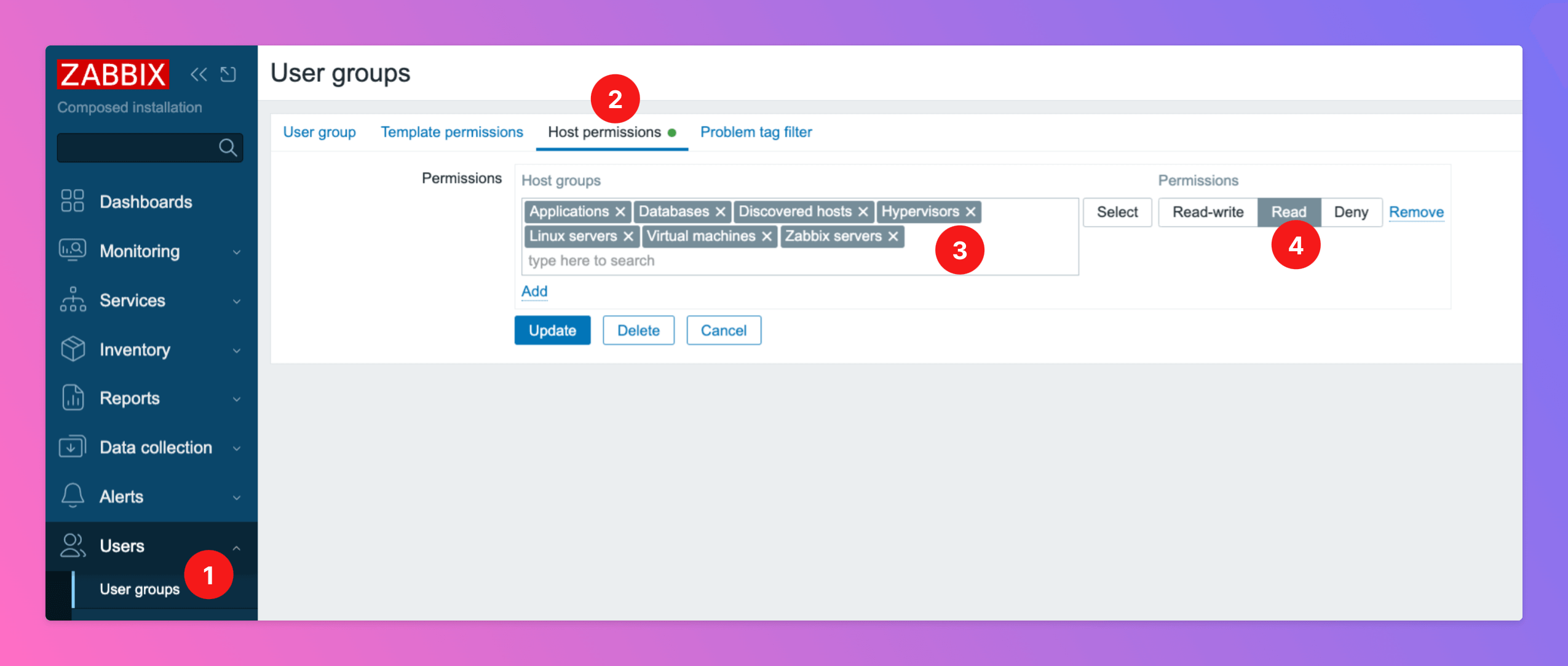 , e.g. “All Quiet” and create a password. - Add the User to one of your User Groups have that read permissions for the host(s) you want to connect with All Quiet. We will show you how to do this later