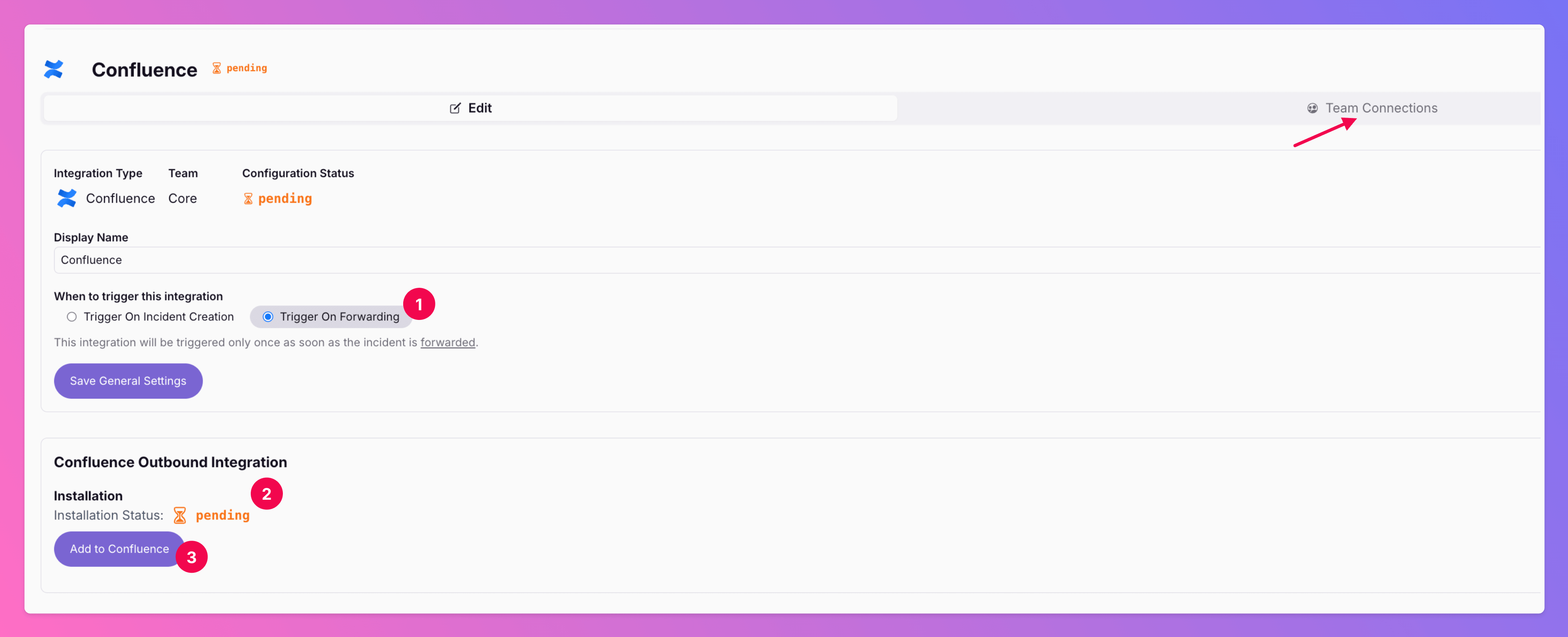 Trigger on Forwardingis enabled by default. This means, that we will not automatically forward incidents to create pages in your Confluence space. Pages will only be created if users manually forward specific incidents or if you set up advanced routing rules for your Confluence integration that automatically forward incidents in specific scenarios. If you enableTriggers On Incident Creation, we will forward all incidents to Confluence as soon as they are created.You can change your selection anytime, but we recommend to selectTrigger on Forwarding. We will explain why in the example below. - Observe that the installation status of the All Quiet integration is still pending.