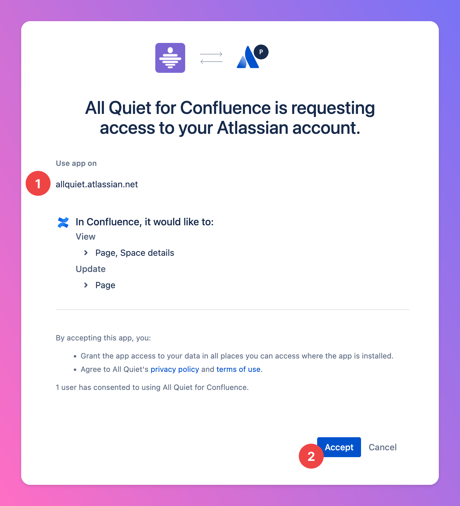 - If your Atlassian account is linked to more than one Confluence site, select the site you want to connect All Quiet to.