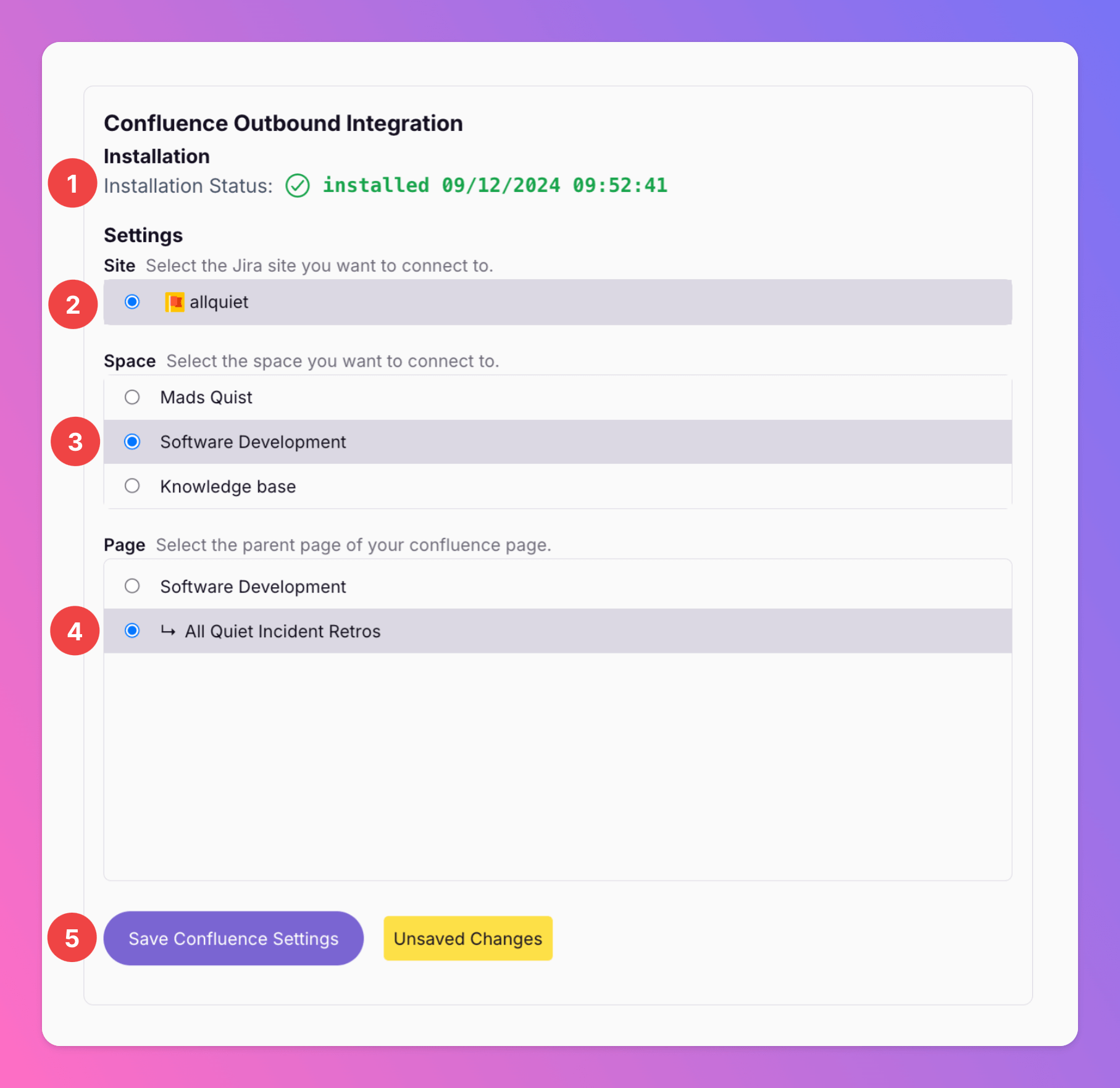 - Select the Confluence space in which you want to create pages based on All Quiet incidents.
