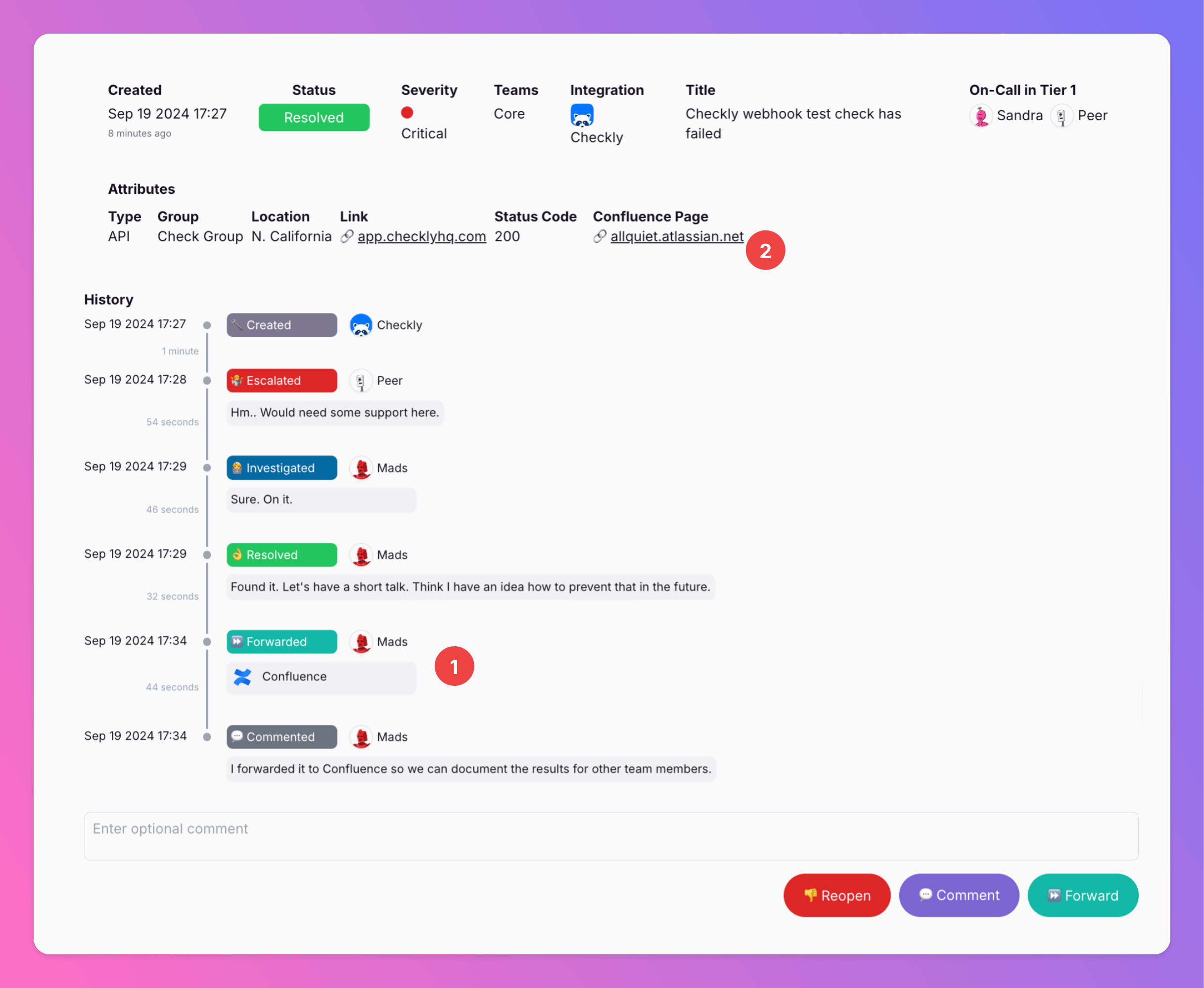 Confluence is now integrated with All Quiet. Depending on your setup, All Quiet incidents can now be forwarded manually to your Confluence space or automatically create pages.
