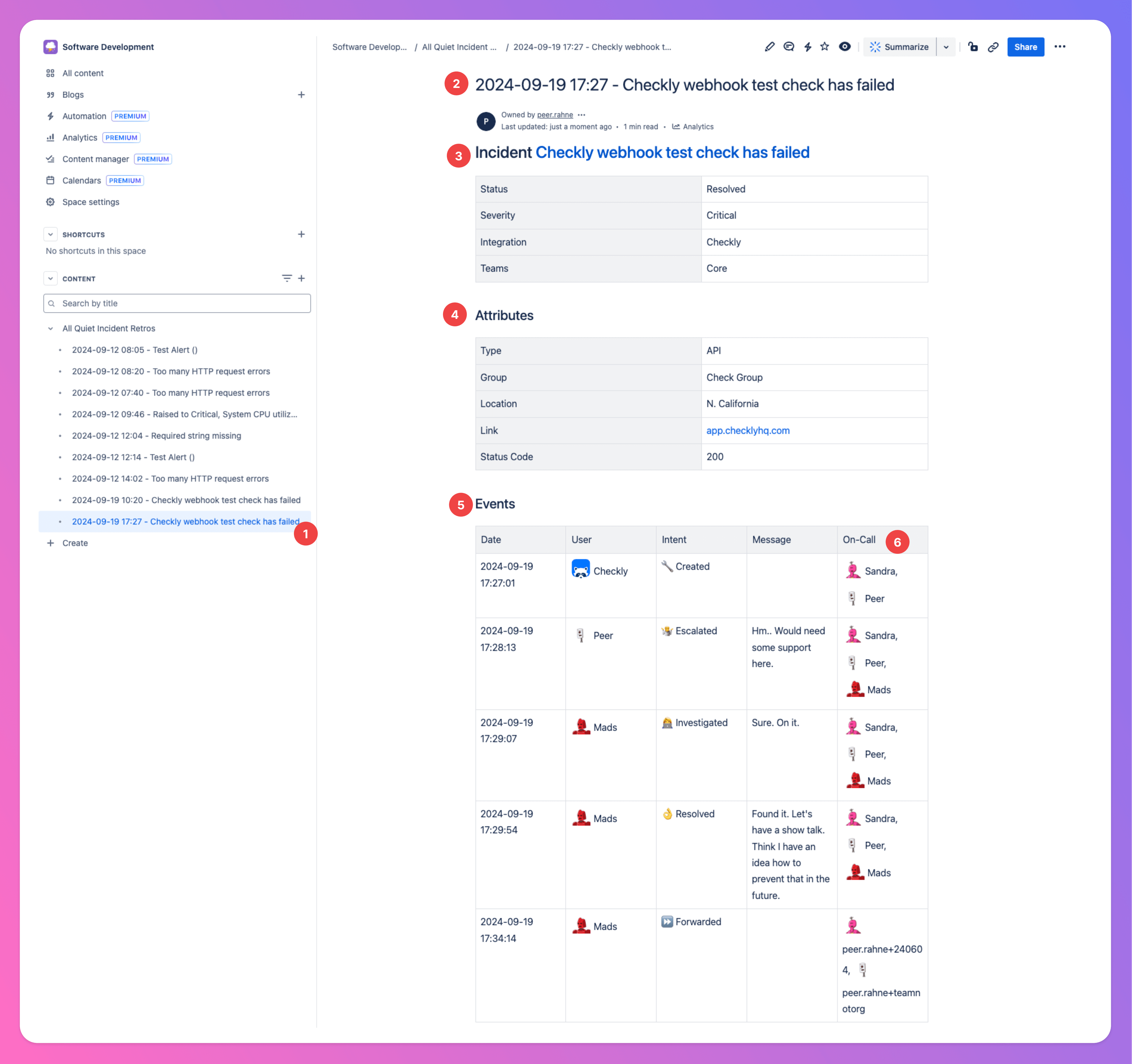 In the following part, we want to quickly demonstrate how a Confluence page created from an incident can look like. In the screenshot below, you can find an All Quiet incident.- There was some communication going on, and the team agreed to have a Retro for this incident. That’s why Mads forwarded it to Confluence.
