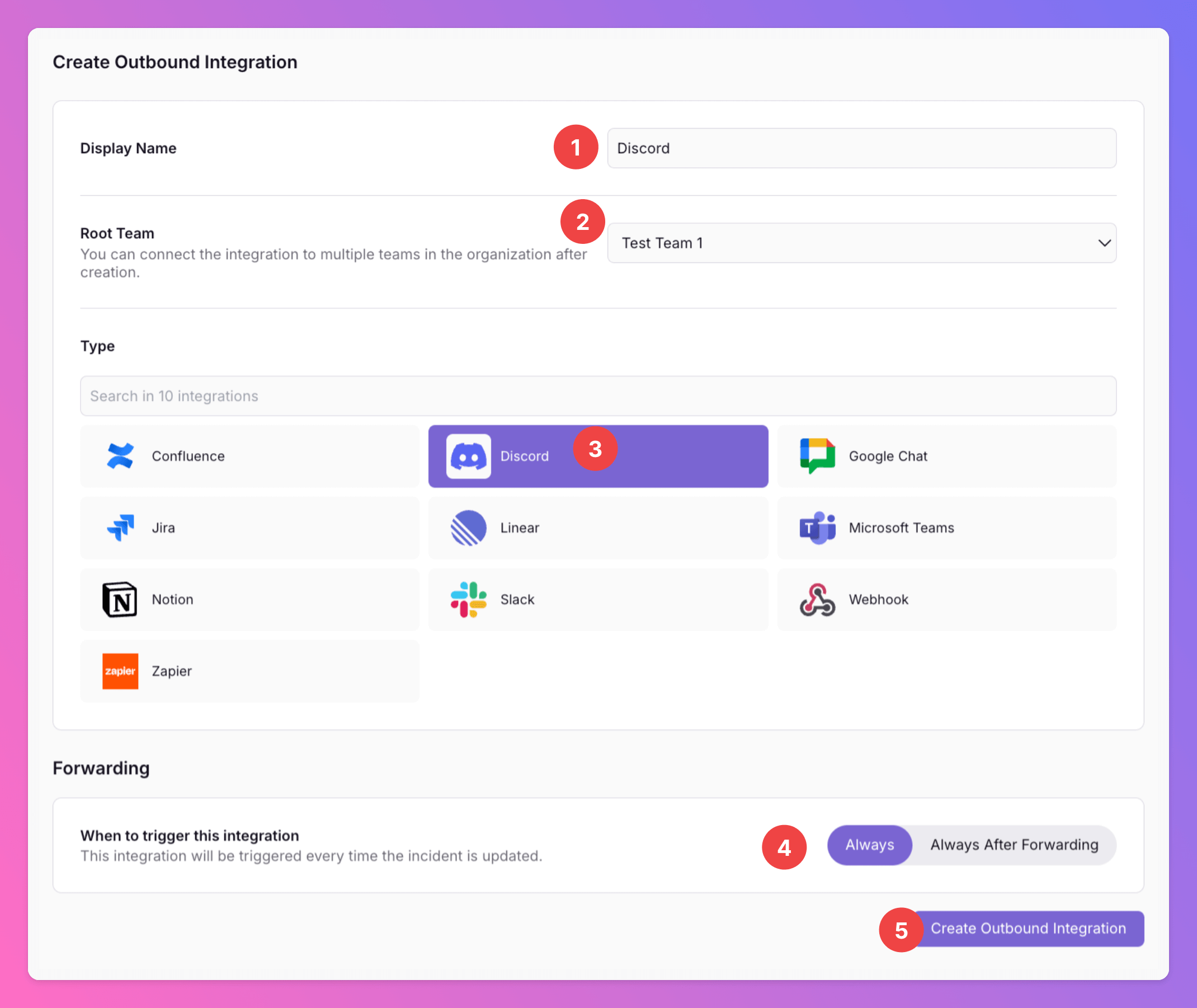 Discordas the integration’s type. - Forwarding settings: