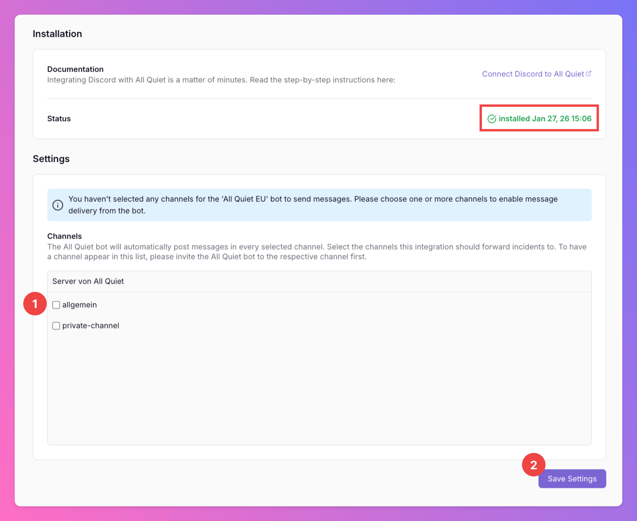 - For All Quiet to send incidents to your Discord channels, you must select at least one channel.