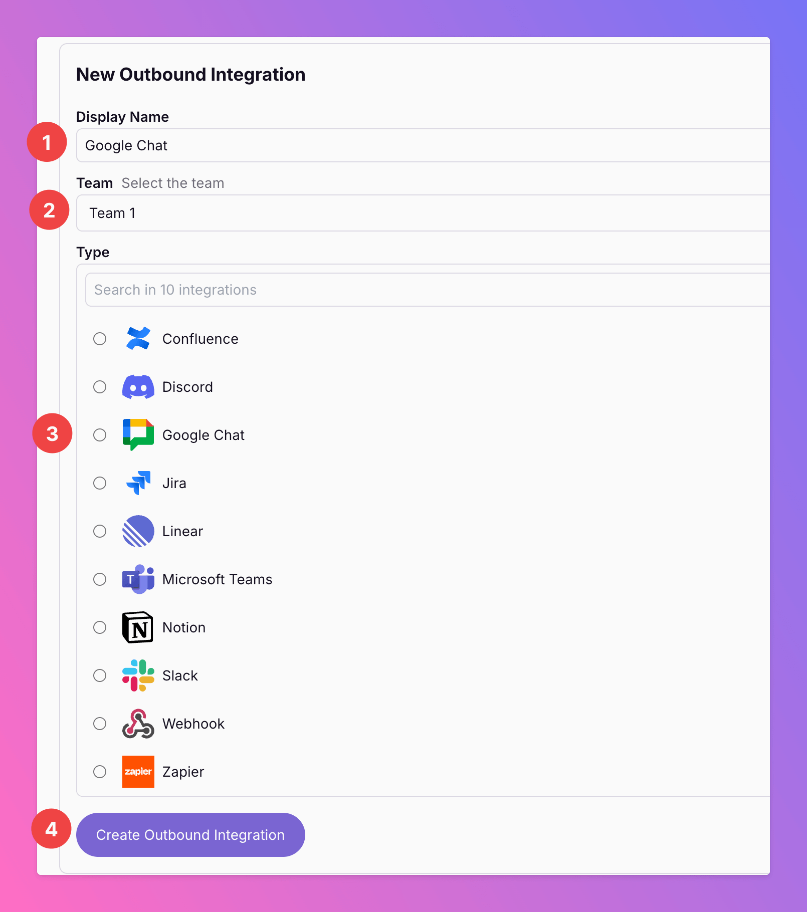- In the Display Name field, provide a name for your integration. For instance, you can name it “Google Chat”.