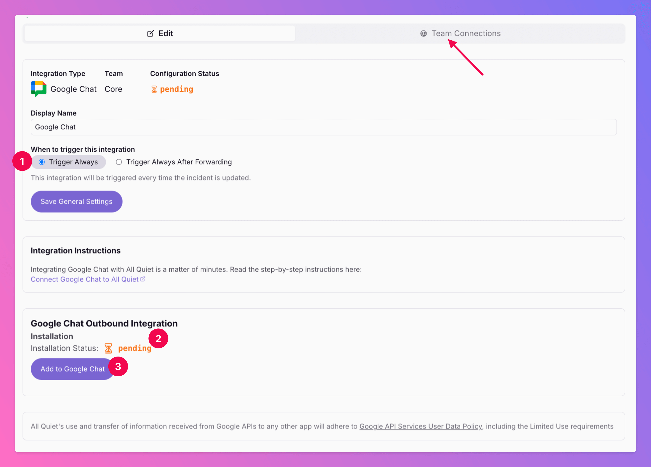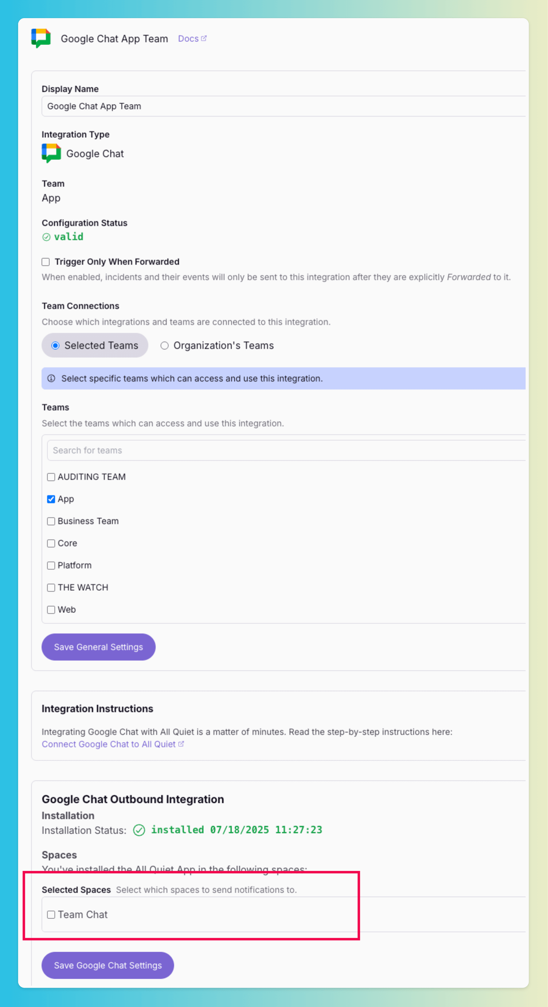 , we will not automatically send messages to your team’s spaces. Messages will only be sent if users manually forward specific incidents or if you set up advanced routing rules for your Google Chat integration that automatically forward incidents in specific scenarios. You can change your selection anytime. - Notice that the installation status of the All Quiet integration is still pending.