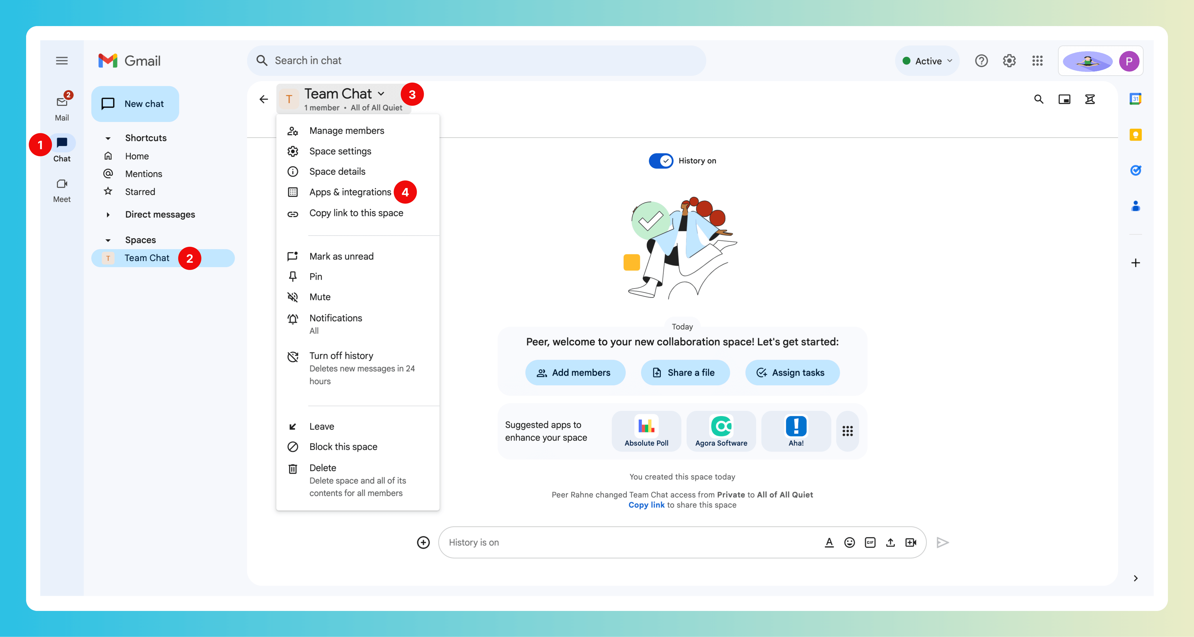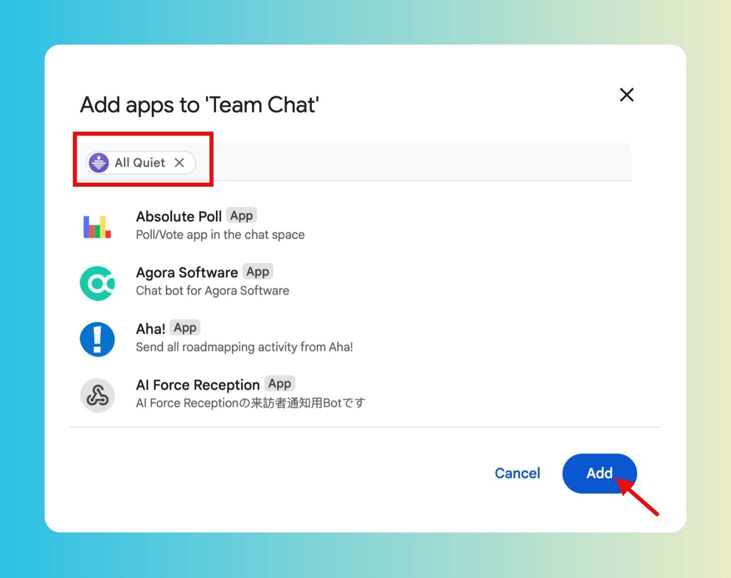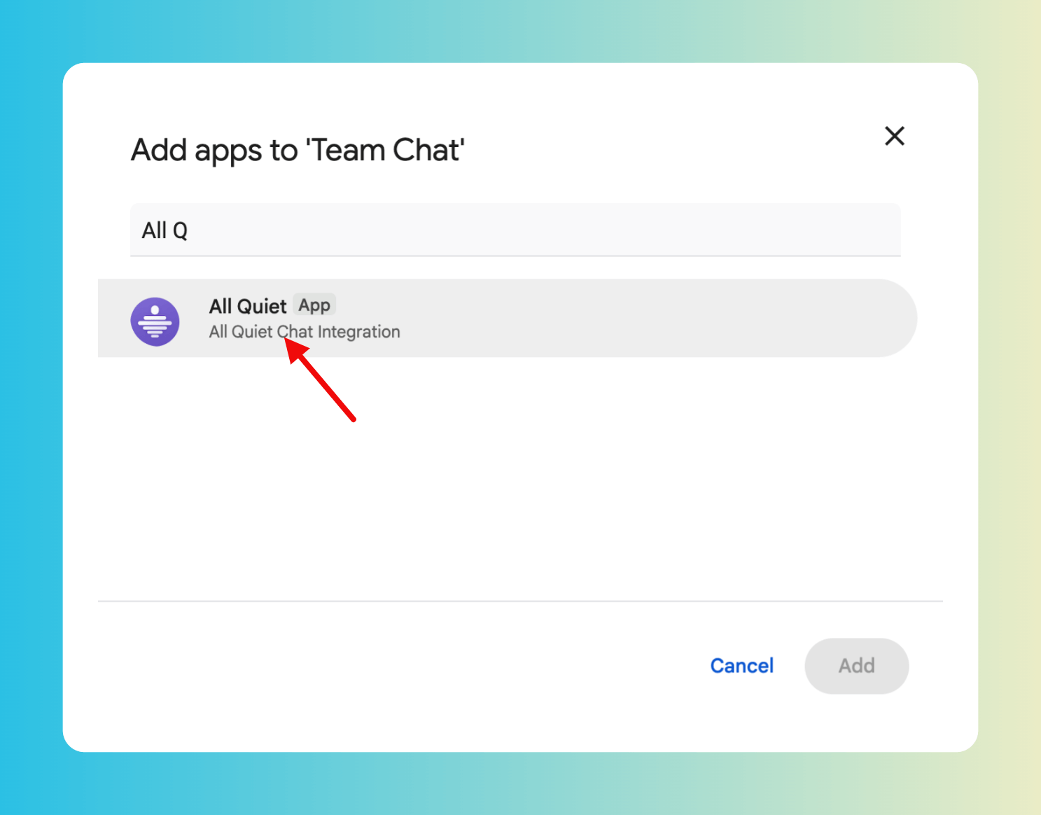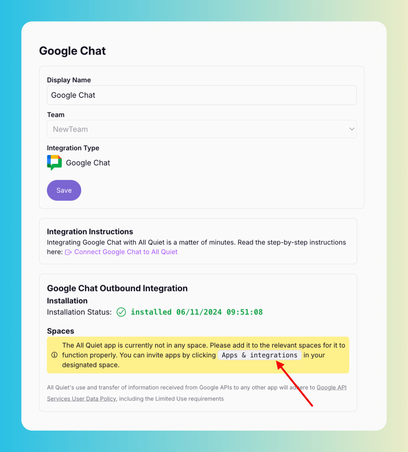 - For All Quiet to send incidents to Google Chat, you must add All Quiet to at least one space.