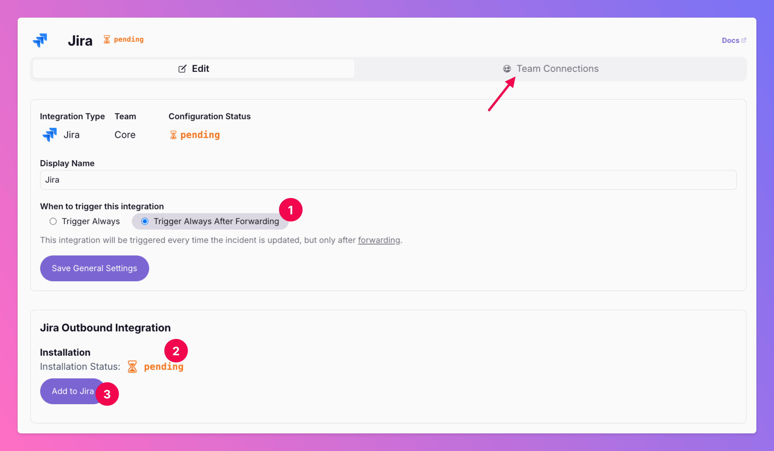 , we will forward all incidents to Jira, unless excluded by additional advanced routing rules. You can change your selection anytime. - Observe that the installation status of the All Quiet integration is still pending.