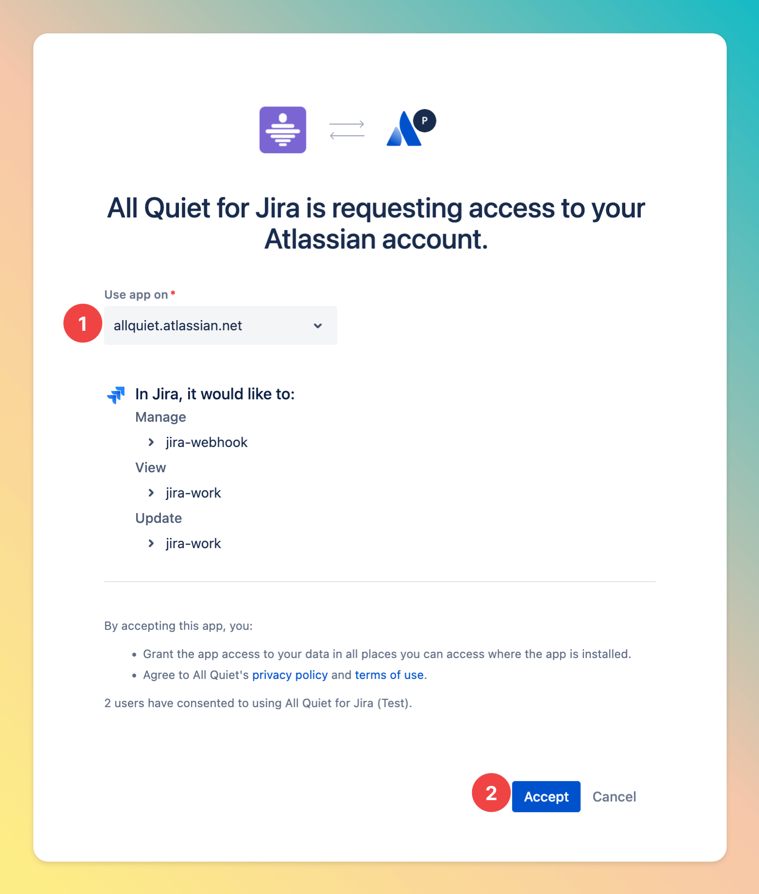 - If your Atlassian account is linked to more than one Jira site, select the site you want to connect All Quiet to.