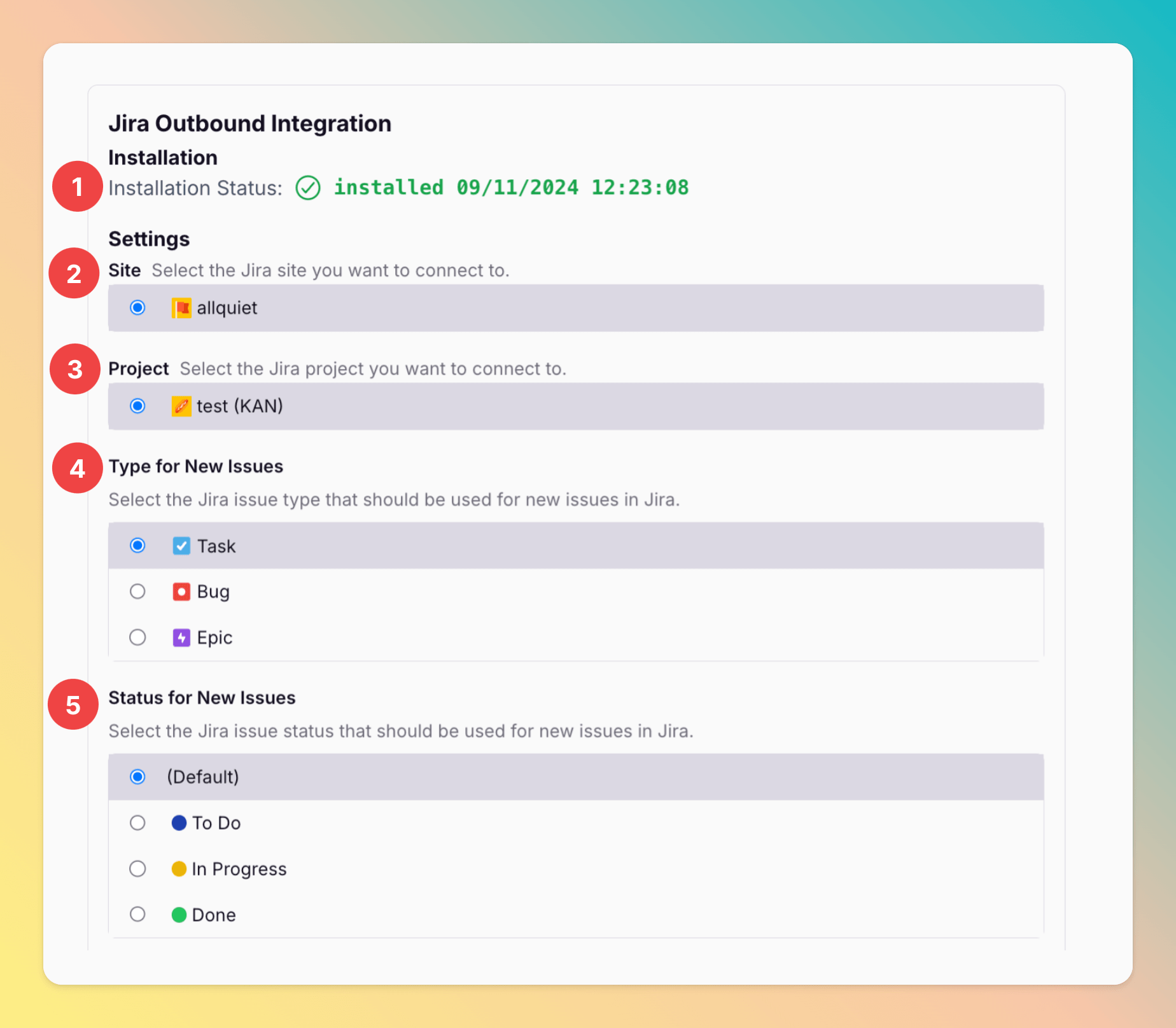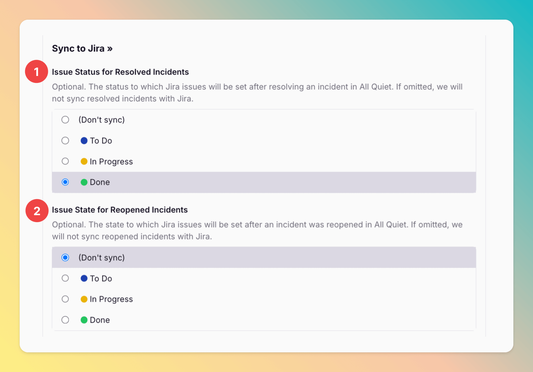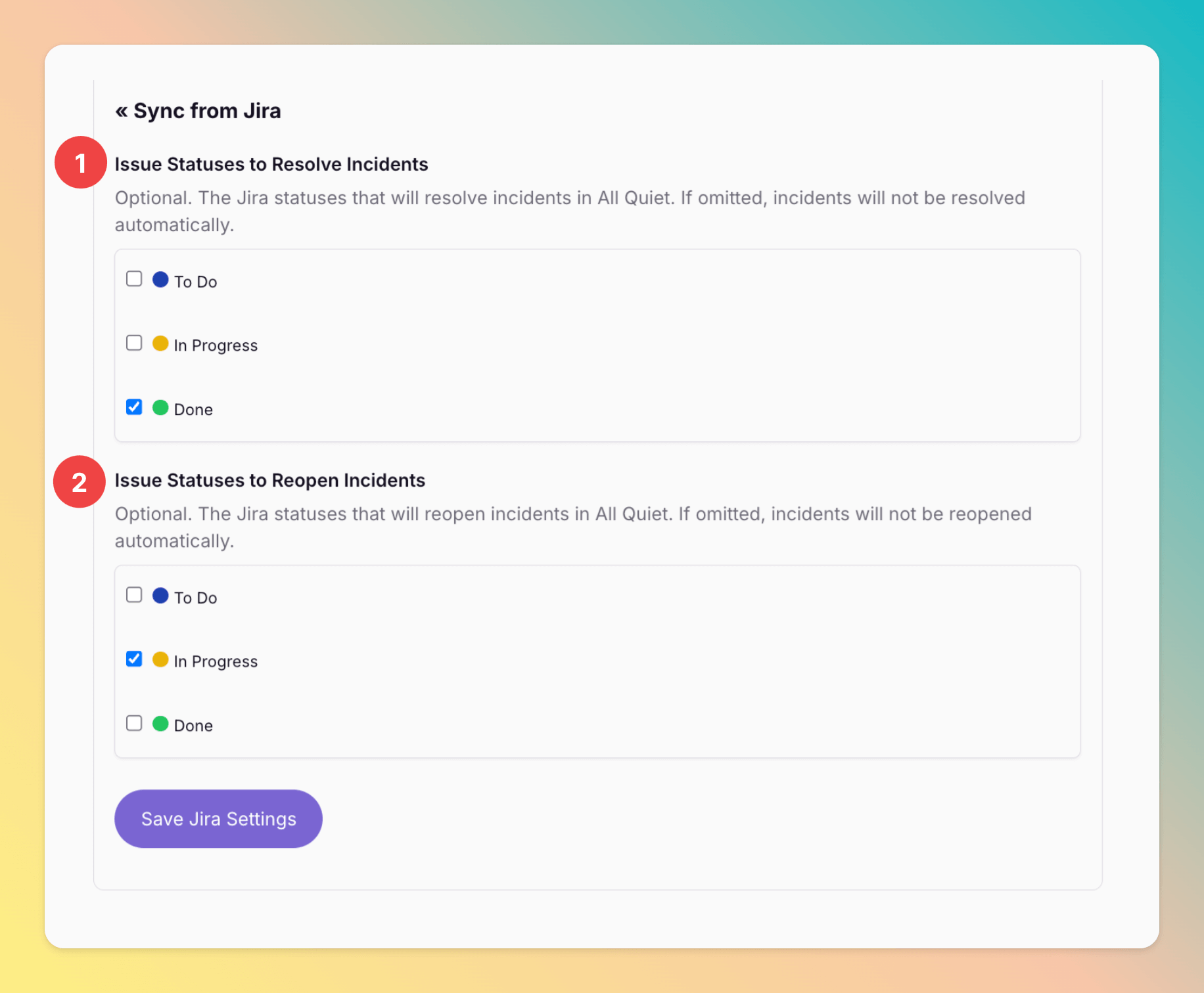 - Select the Jira issue status you want to set after resolving an incident in All Quiet.
