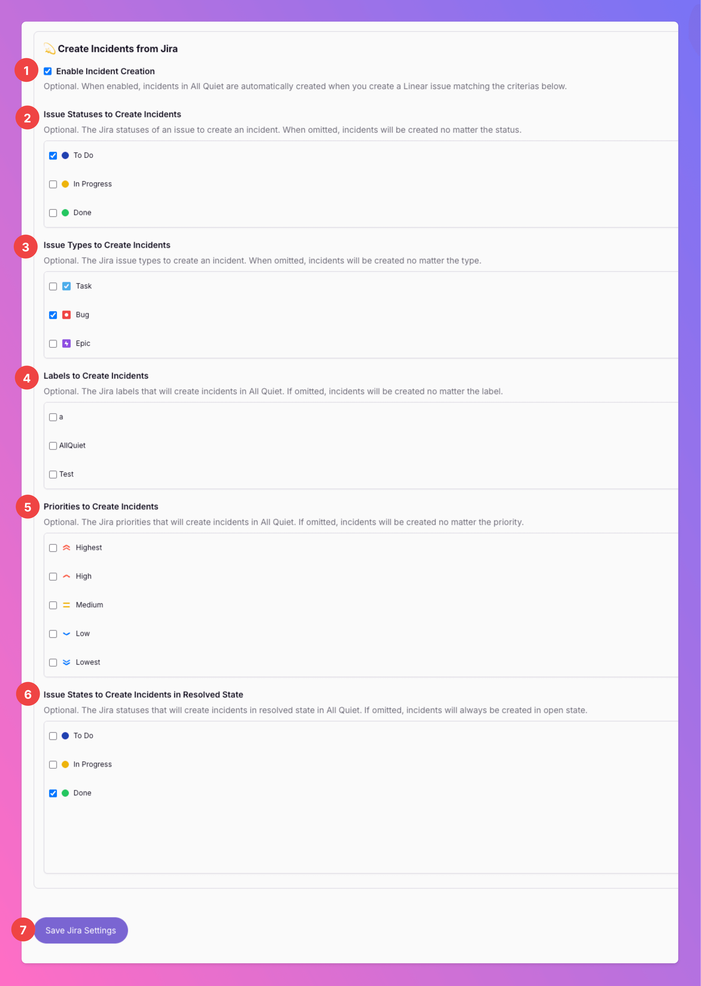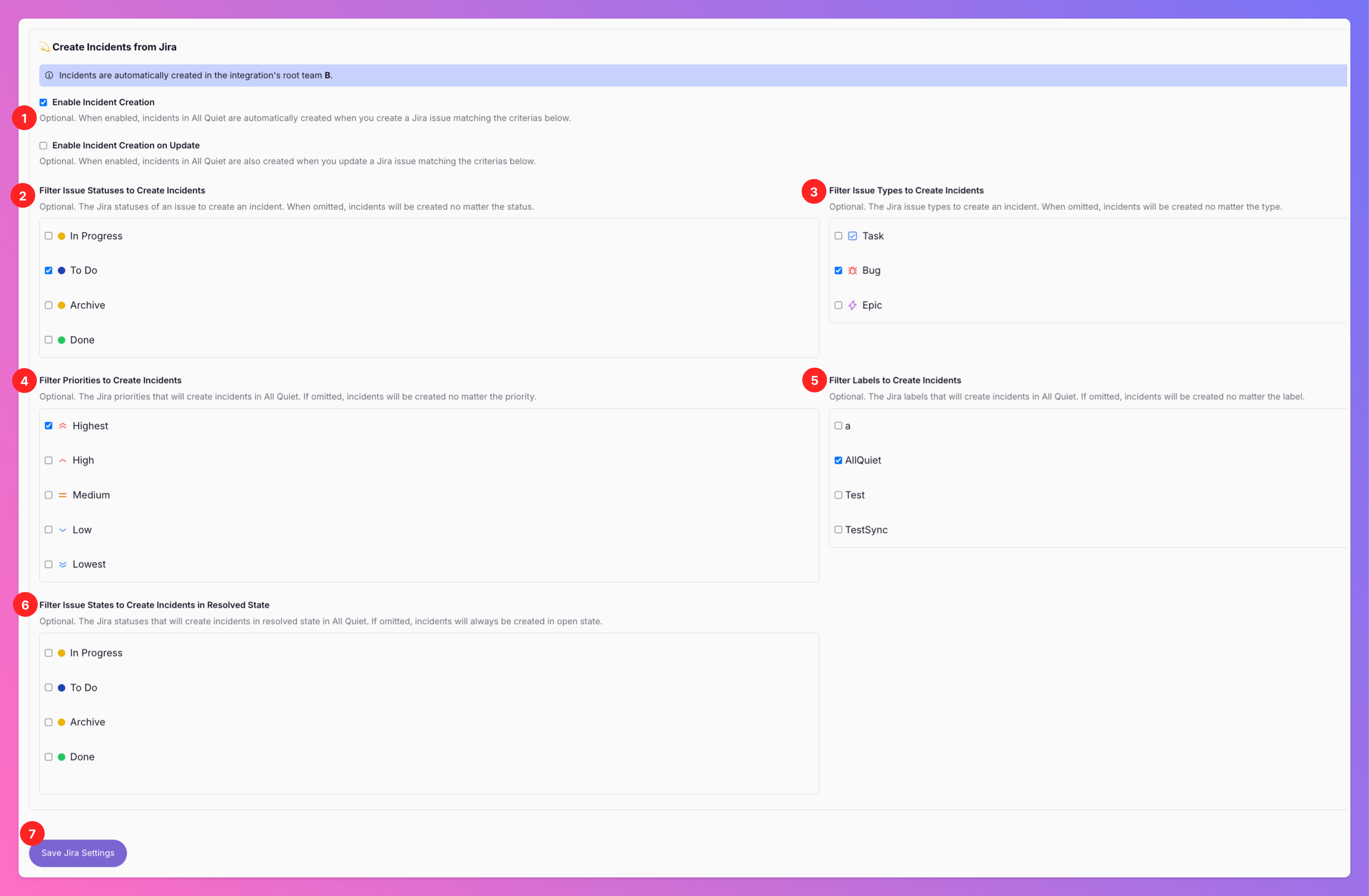 - You can select if only Jira Issues that are created with certain labels will create an All Quiet incident. If omitted, incidents will be created no matter the label.