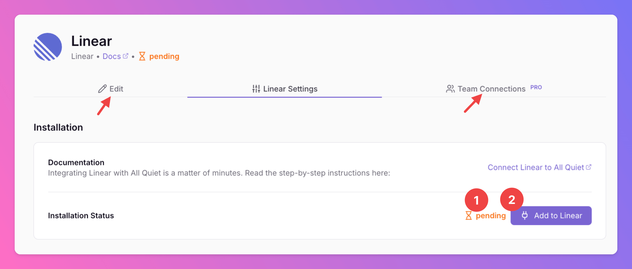 Then, your are redirected back to your Linear integration’s details page in All Quiet. Next, you need to configure the integration.- As you can see, the Installation Status changed to