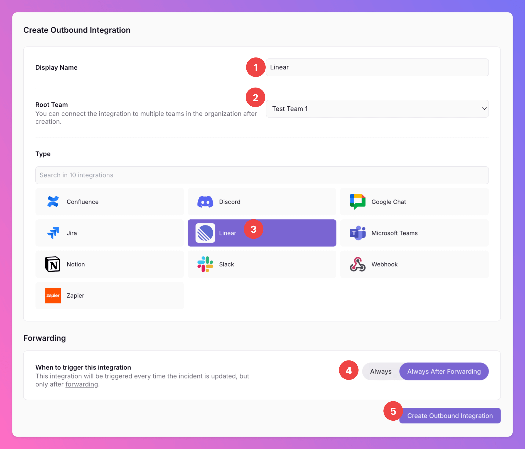 Always After Forwarding- Linear issues will only be created if users manually forward specific incidents or if you set up advanced routing rules for your Linear integration that automatically forward incidents in specific scenarios. - Alternative: