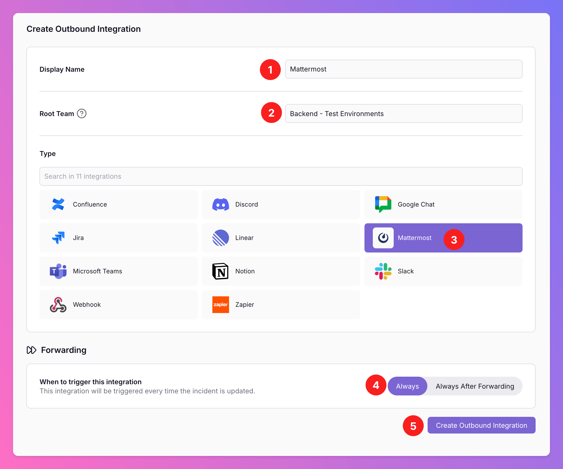 Mattermostas the integration’s type. - Forwarding settings: