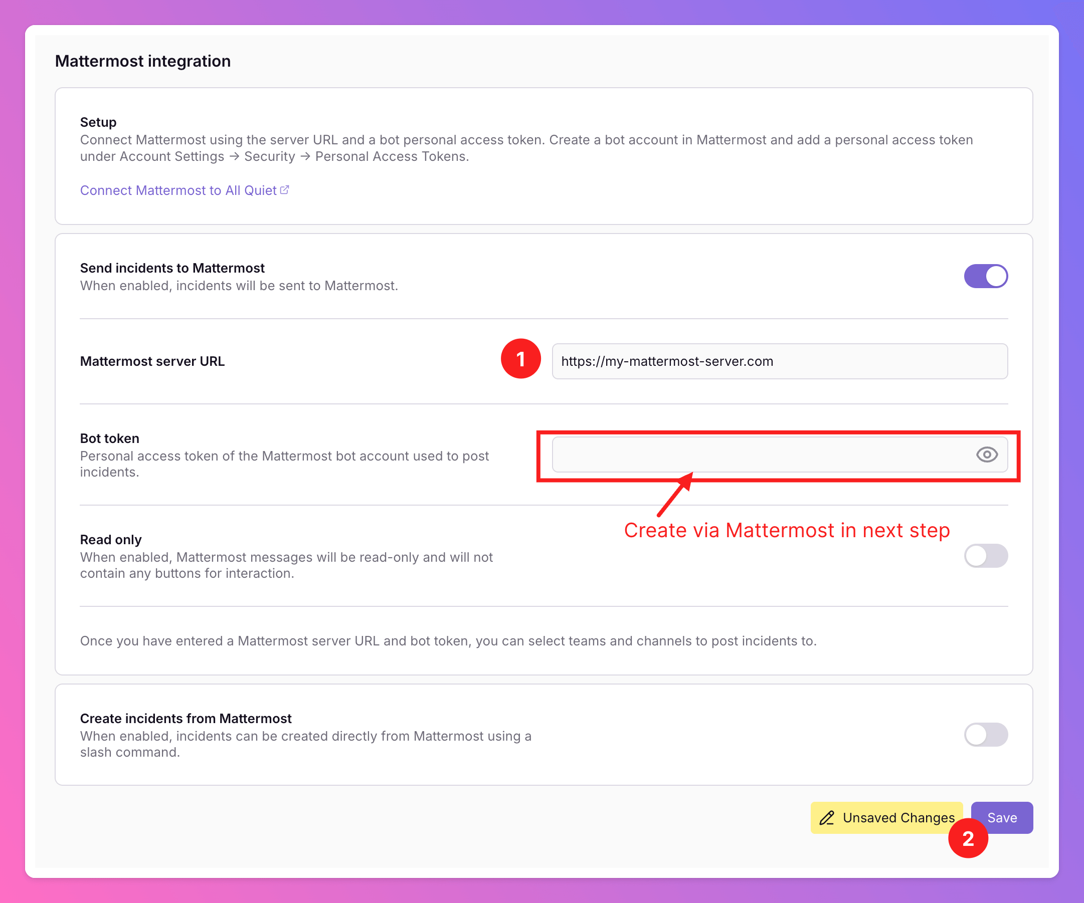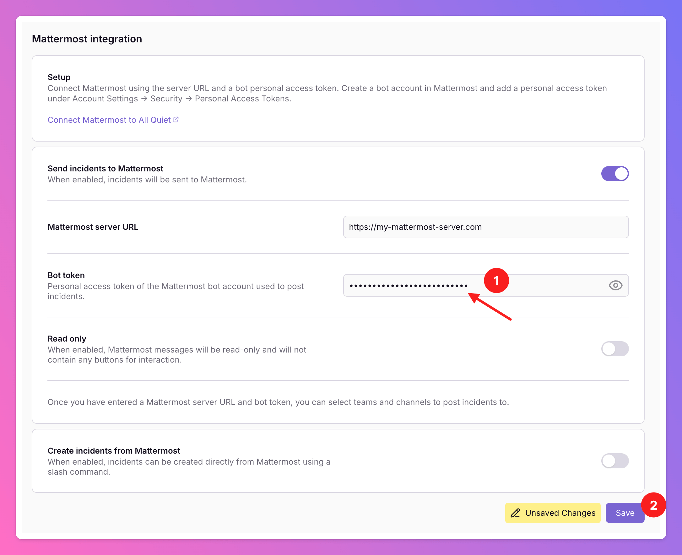 Channels.You need to invite the Bot to the desired Mattermost channels first. After that, the channels will appear in All Quiet, and you can select them. This works for both public and private channels. - You can change your integration settings to “Read Only”. In this mode, we will not send any action buttons to Mattermost, meaning users cannot interact with the messages. This is ideal if you want to use the integration for internal stakeholder management.
