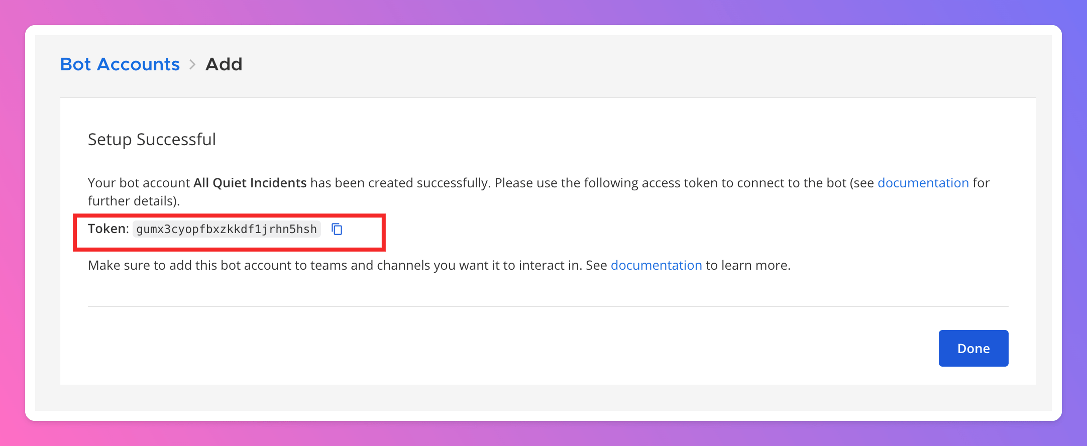 Token. You will need it in the next step to connect the command with All Quiet.