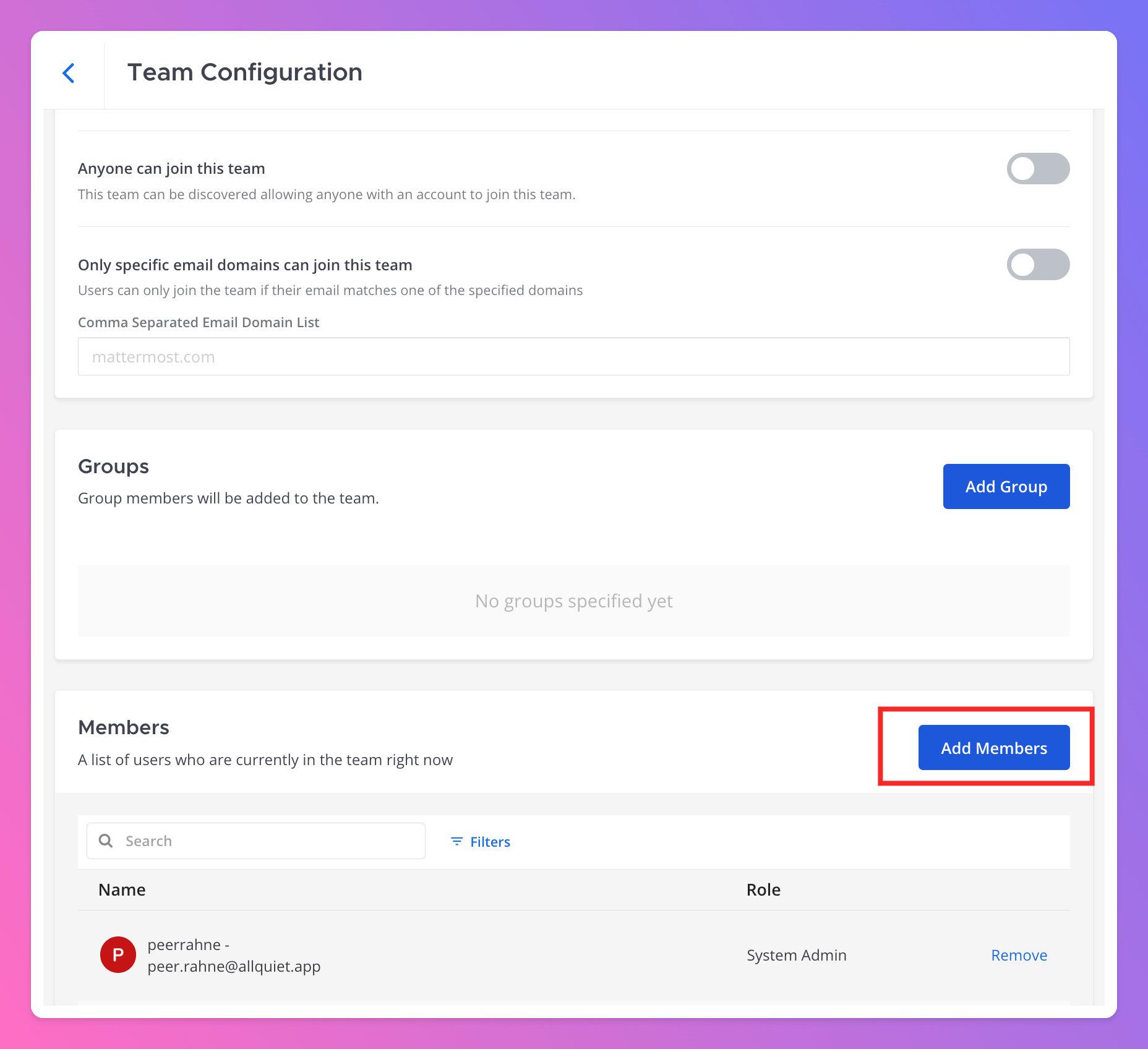 Team Configuration page, scroll down to the Members section. Click Add Members.