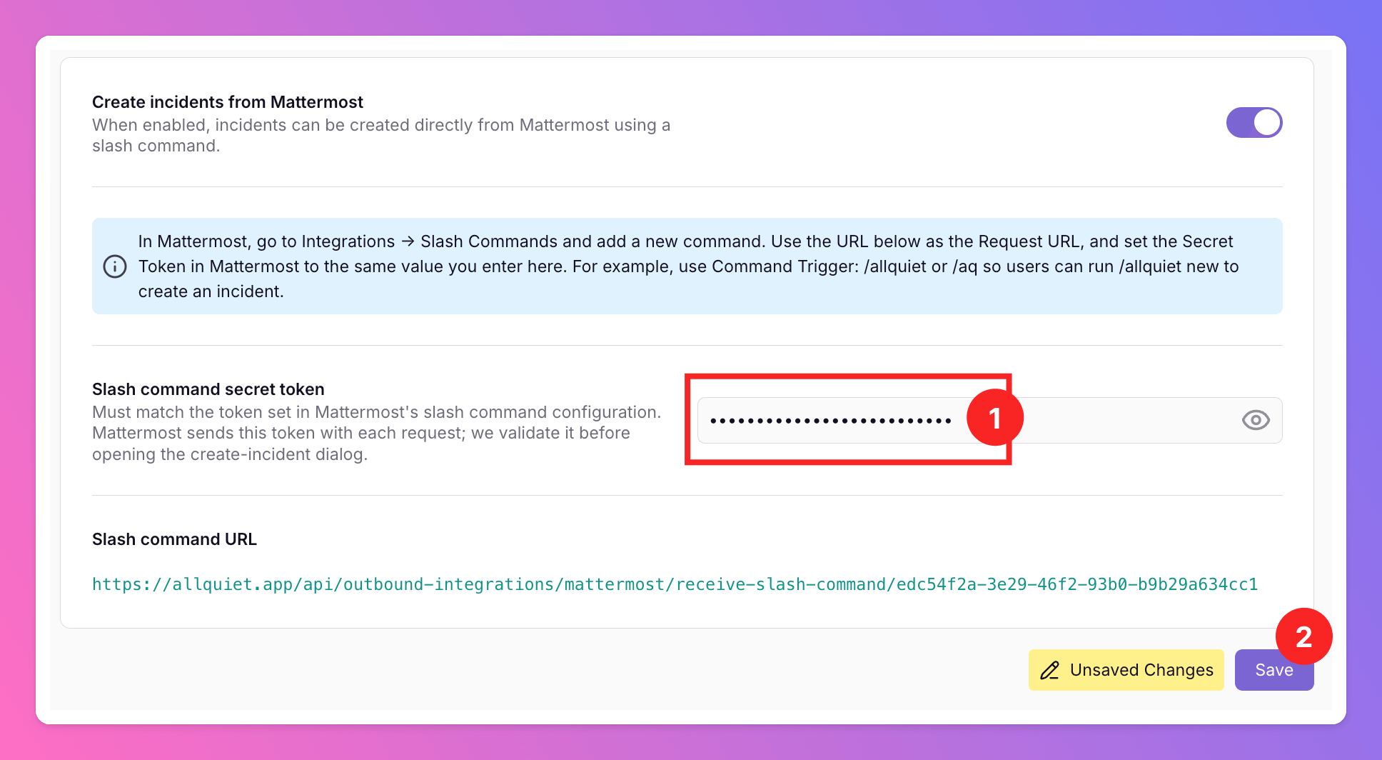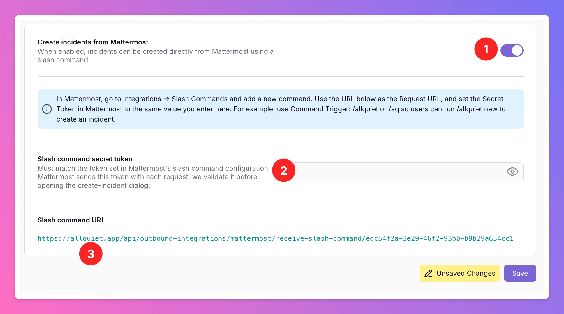 Slash command URLby clicking on it. You will need it to connect the Mattermost slash command with All Quiet.