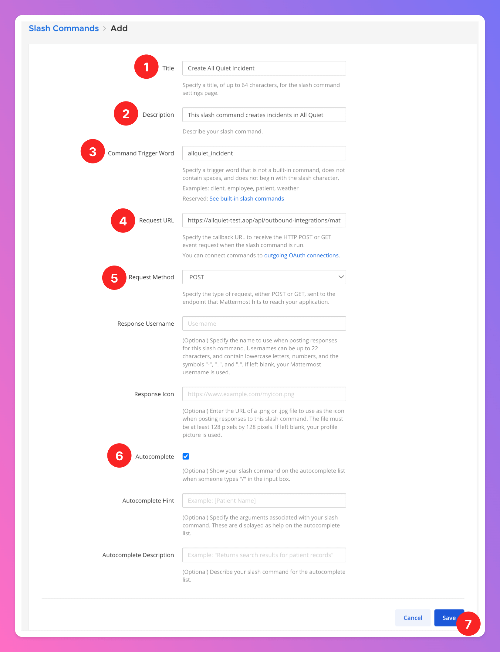 Titlefor the slash command, likeCreate All Quiet Incident. - You may add a