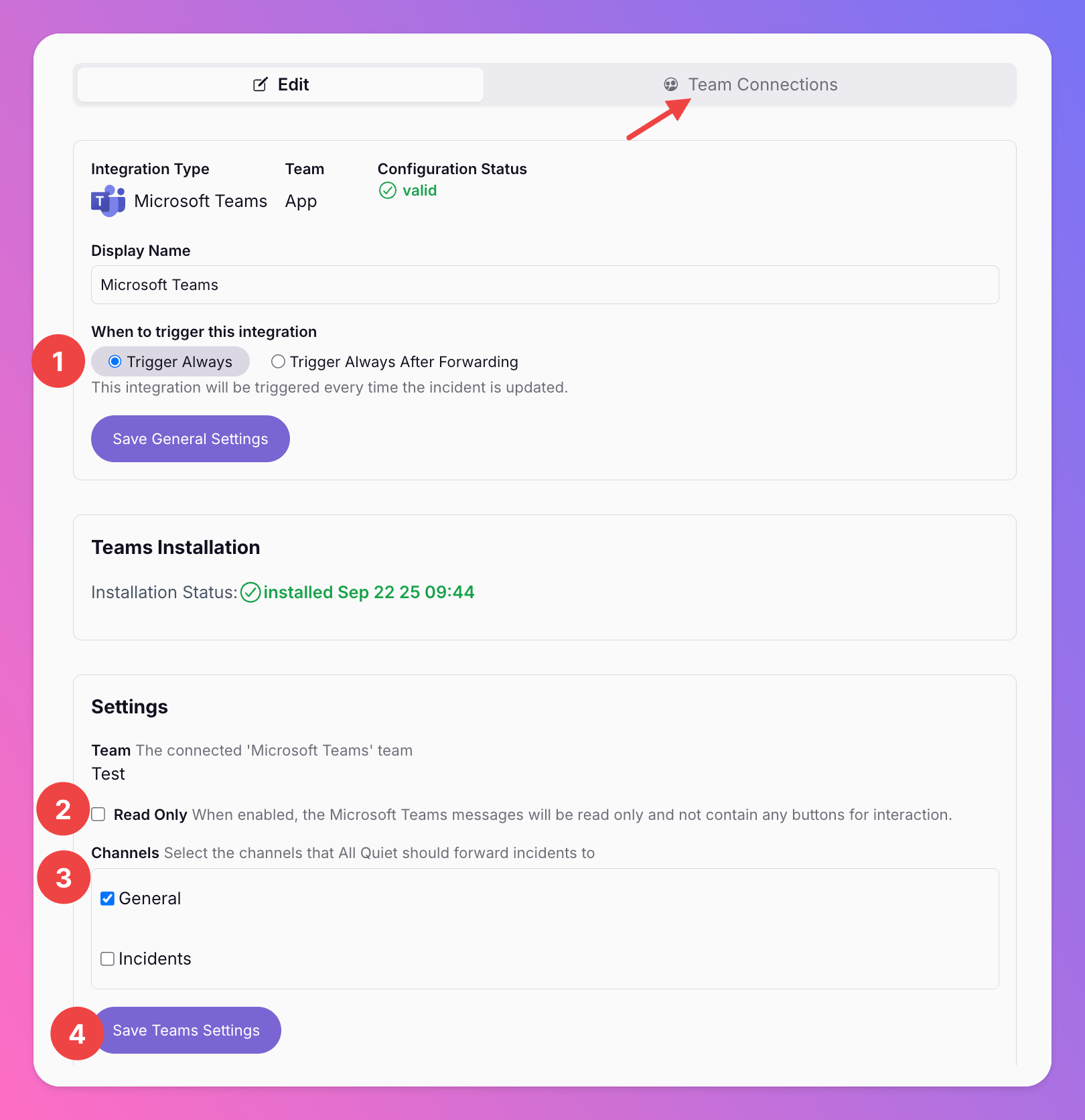 To send All Quiet incidents to your MS Teams channels, you must complete the following additional configuration steps. After connecting All Quiet and MS Teams, complete the following information on the same page.- The option