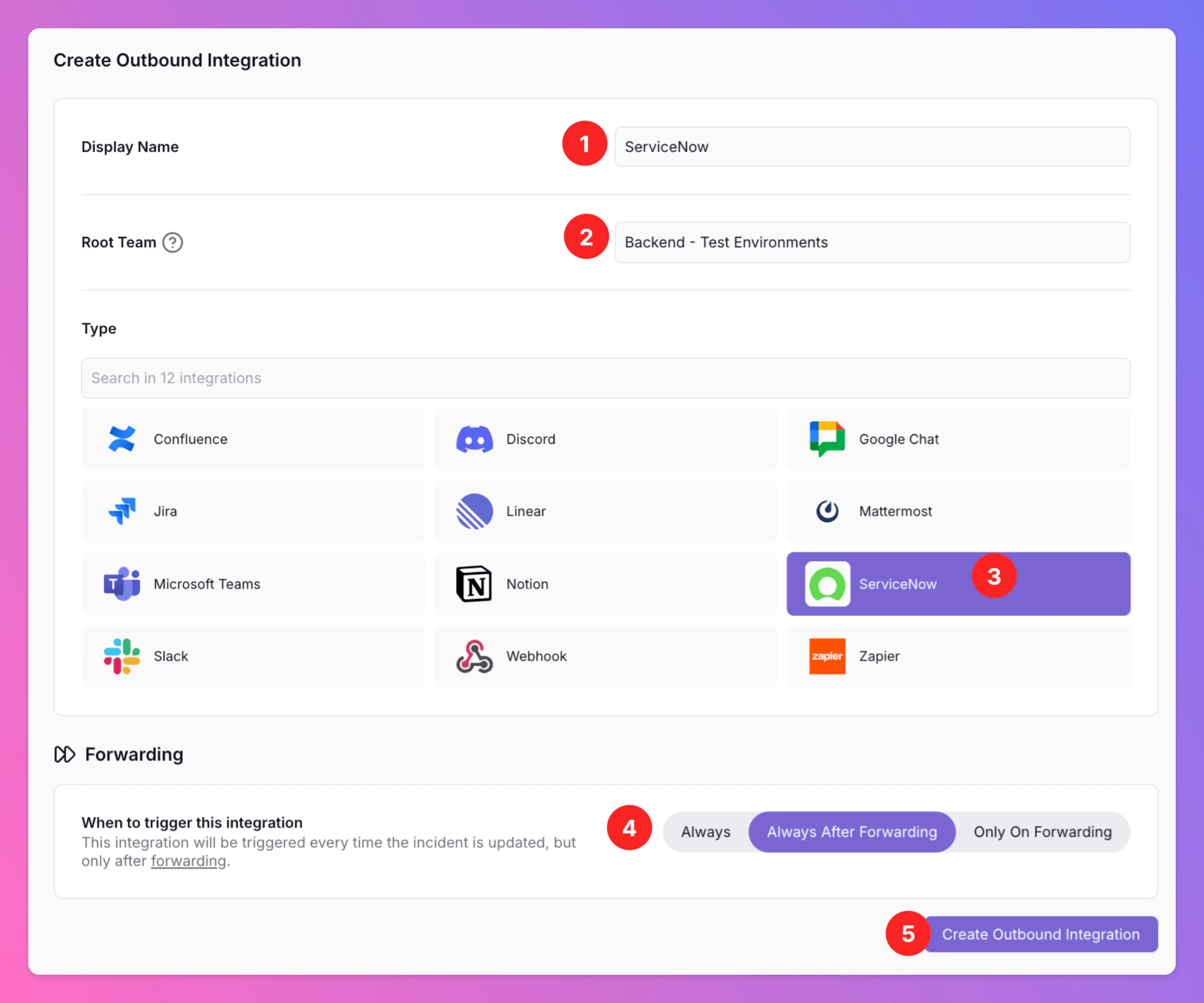 Only On Forwarding— forward a snapshot of the current incident history to ServiceNow in the moment users manually forward or if you set up advanced routing for your ServiceNow Outbound integration that automatically forwards incidents in specific scenarios. We will not send any incident updates to ServiceNow afterwards. 5Í. ClickCreate Outbound Integration.
