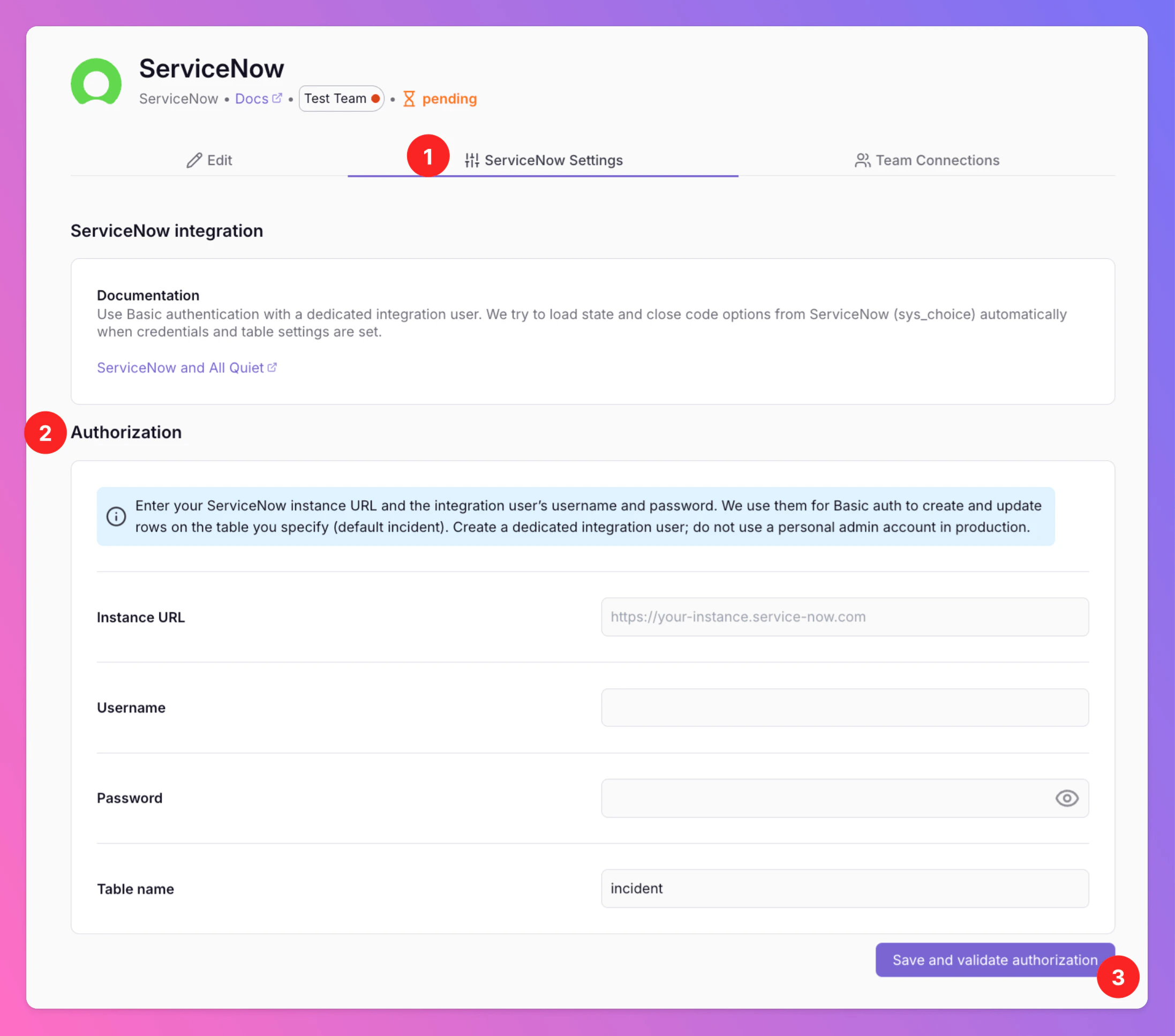 - In All Quiet, open the team’s ServiceNow outbound integration → ServiceNow Settings → Authorization (or equivalent settings for instance credentials).