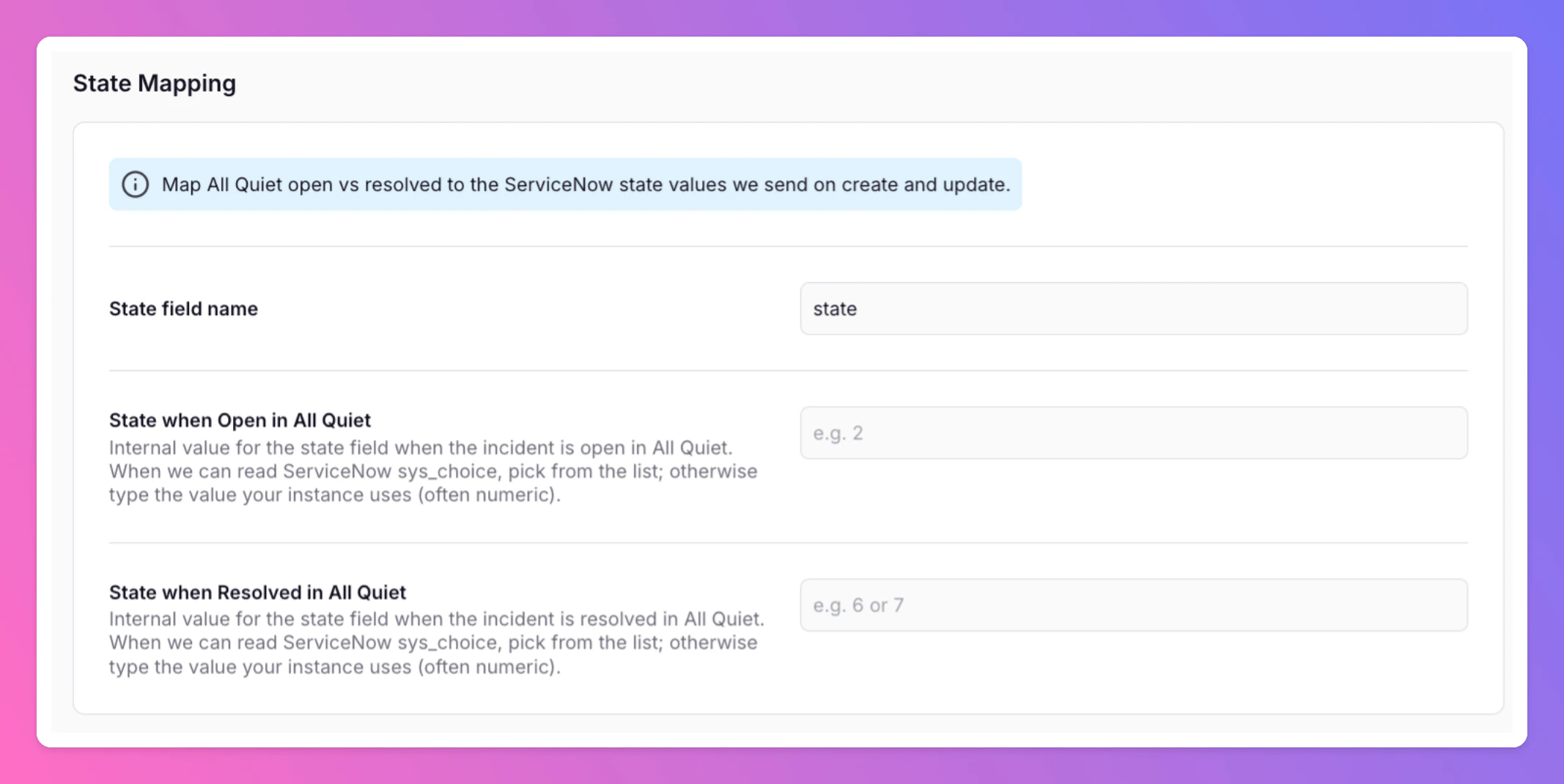 State when Resolved in All QuietInternal ServiceNow value for the state field when the incident is resolved in All Quiet. Same as above: use the dropdown when