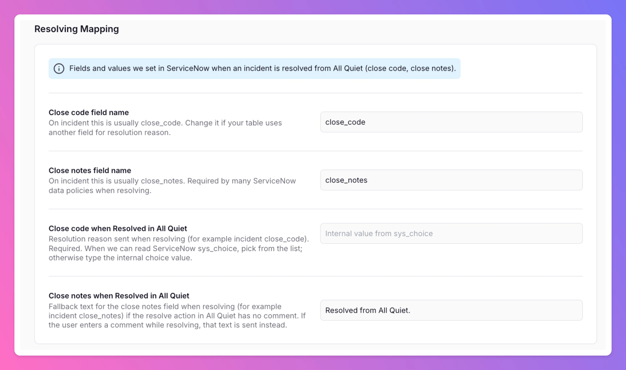 ServiceNow usually requires additional information when resolving an incident. We will send these values to ServiceNow when you resolve an incident in All Quiet. Close code field nameOn incident, this is usually