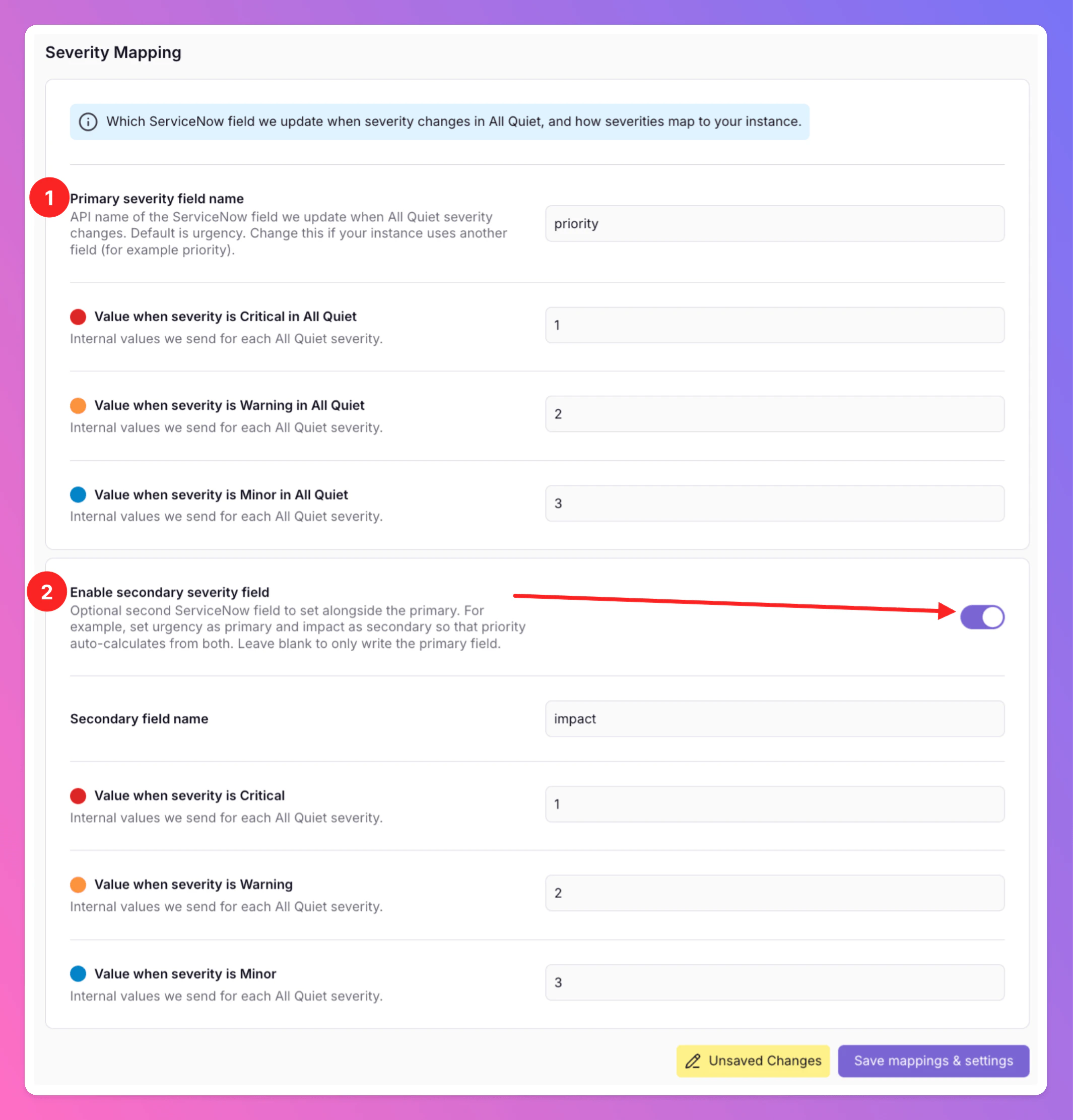 Internal values we send for each All Quiet severity to the primary field by default. When you enable a secondary field, configure its mappings in the UI as well (your instance’s valid values for that field may differ from urgency).