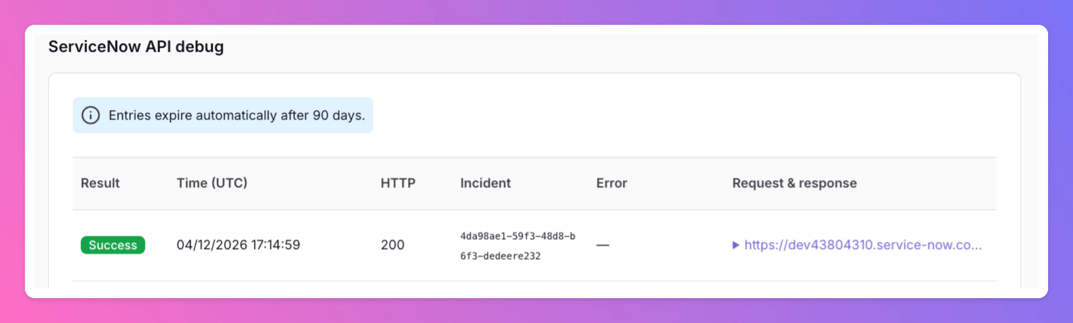If you encounter issues with the integration, you can debug the API calls by looking at the bottom of yourServiceNow Settings tab in All Quiet. You will find the API calls and their responses there.